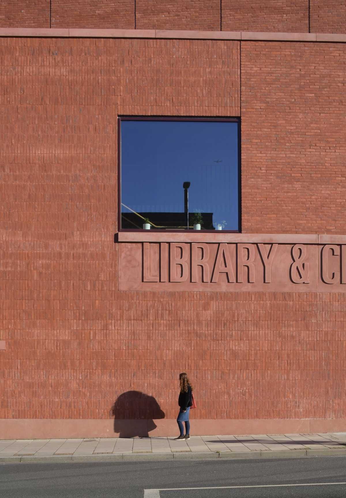 Elewacja biblioteki i kina miejskiego z cegły klinkierowej w ciepłym, naturalnym odcieniu czerwieni. Charakterystyczna faktura cegły podkreśla nowoczesną architekturę budynku publicznego i nadaje mu ponadczasowy, elegancki wygląd w przestrzeni miejskiej.