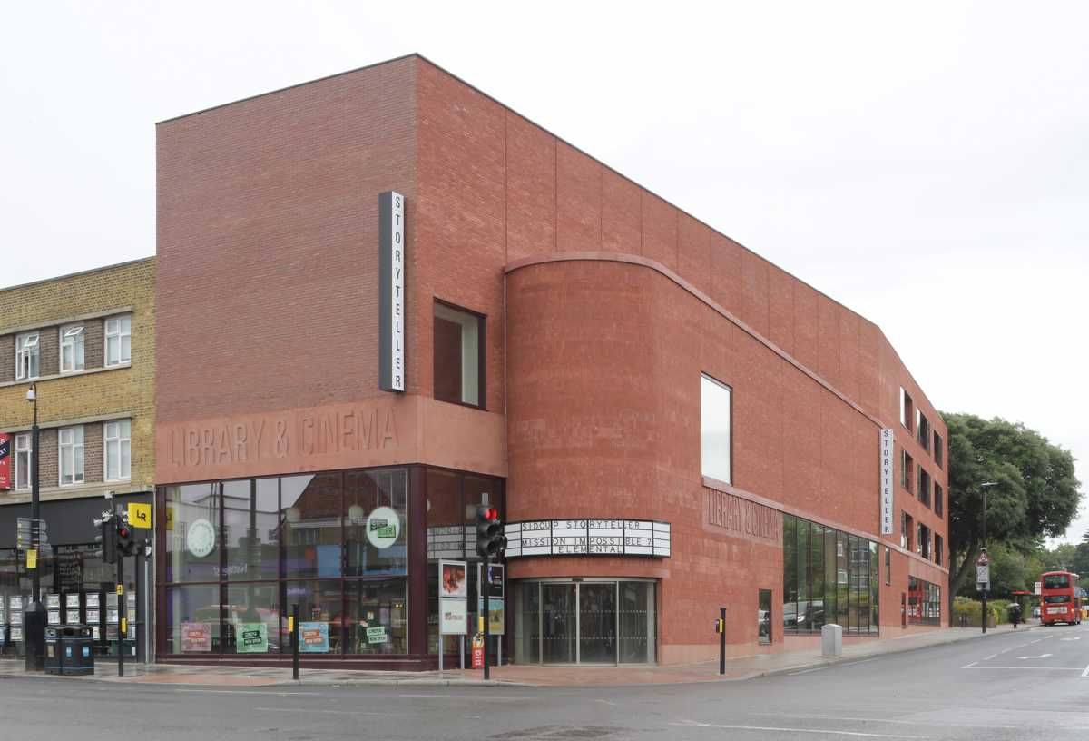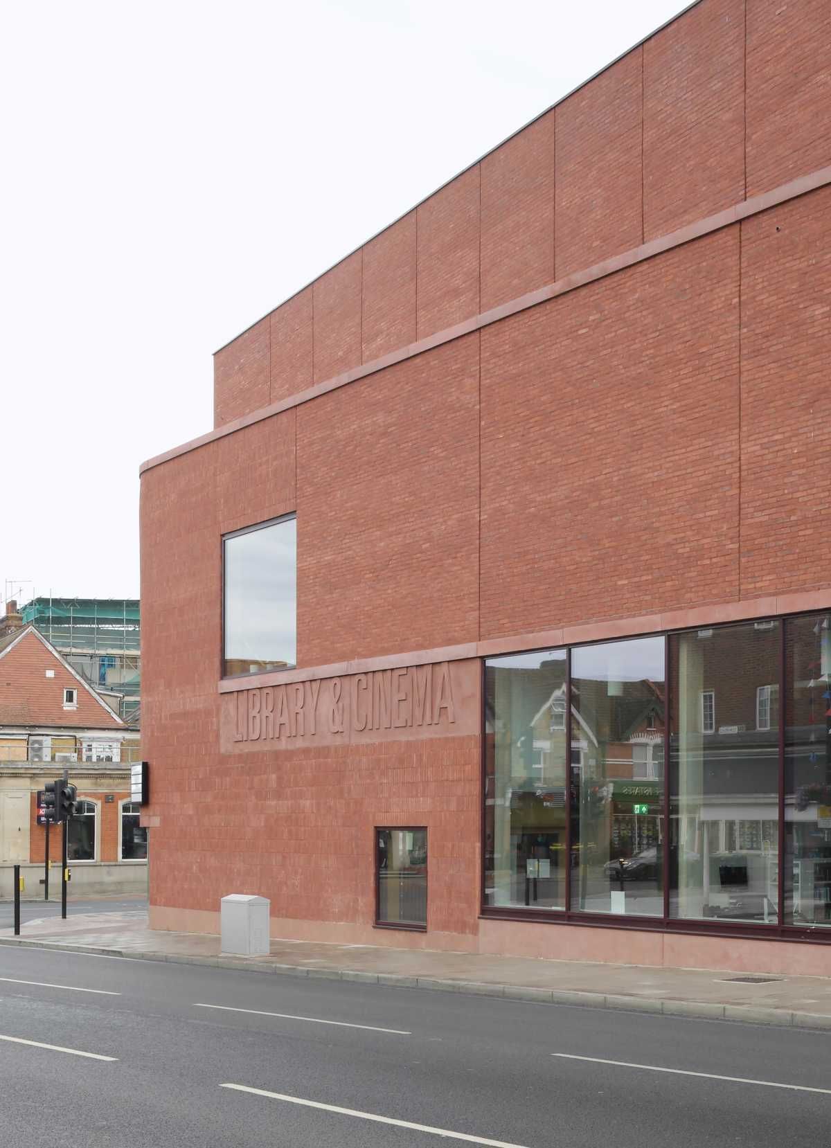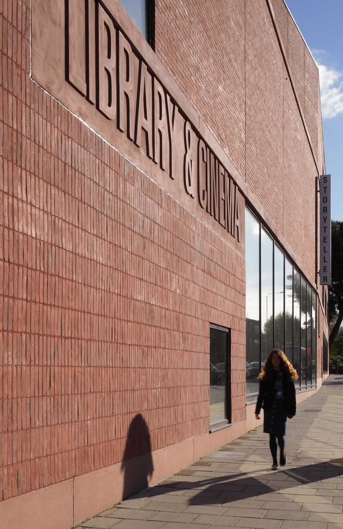 Przeszklony parter biblioteki i kina miejskiego zapewnia wizualne połączenie wnętrza z przestrzenią miasta. Duże tafle szkła kontrastują z masywną, ceglaną elewacją, tworząc nowoczesną, otwartą i zapraszającą architekturę obiektu miejskiego. Transparentność fasady podkreśla dostępność funkcji kulturalnych i sprzyja naturalnemu przenikaniu życia ulicy do wnętrza. Całość buduje wizerunek miejsca otwartego na mieszkańców i codzienne miejskie aktywności.