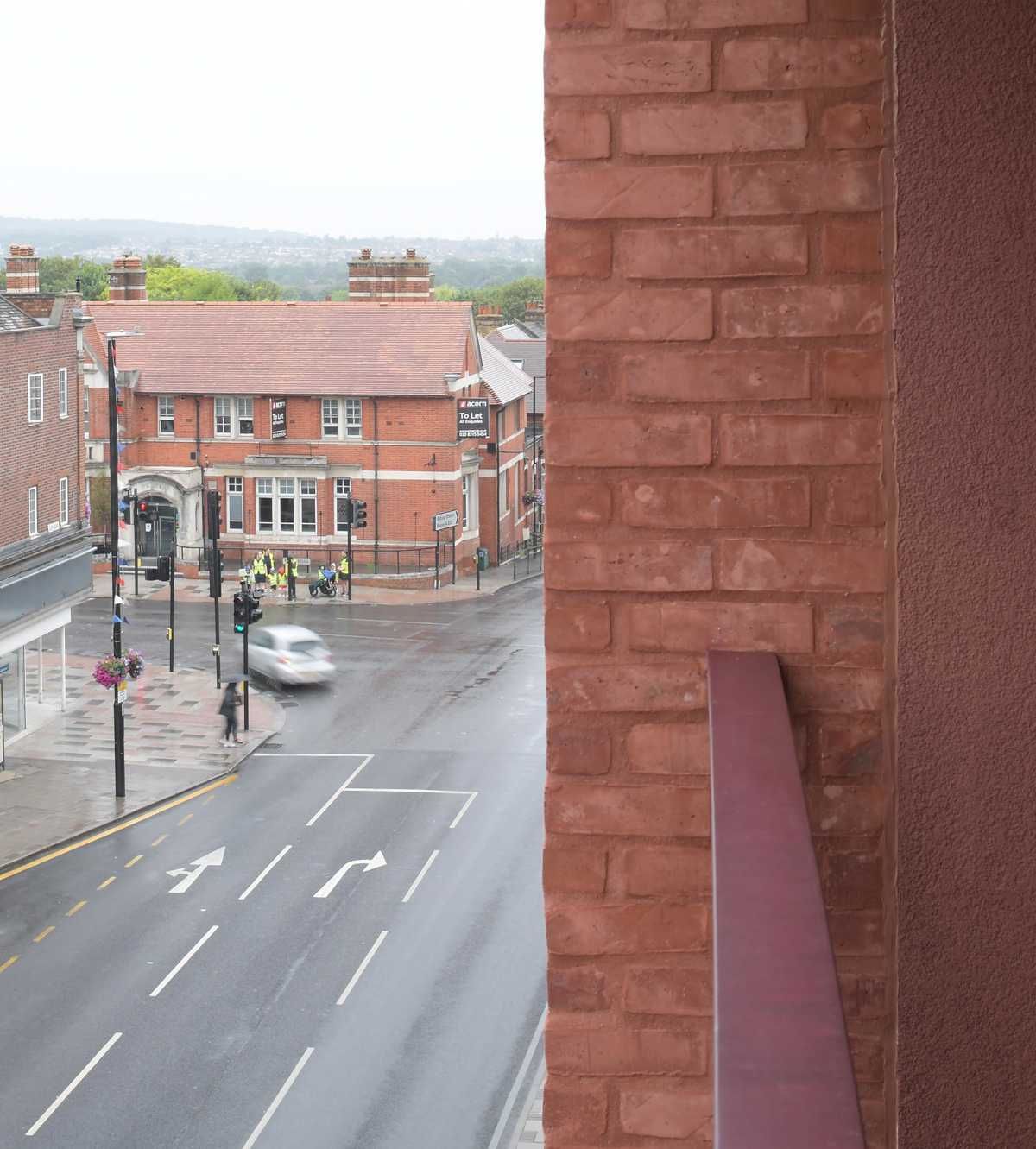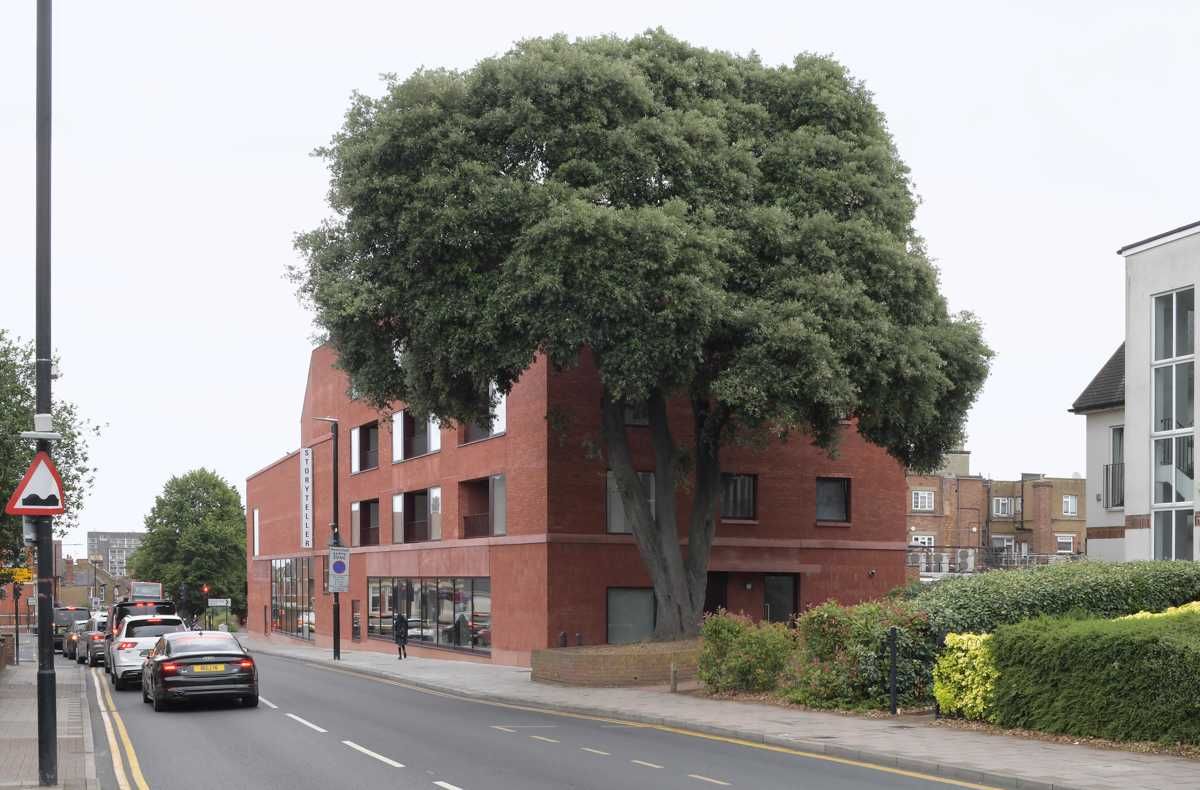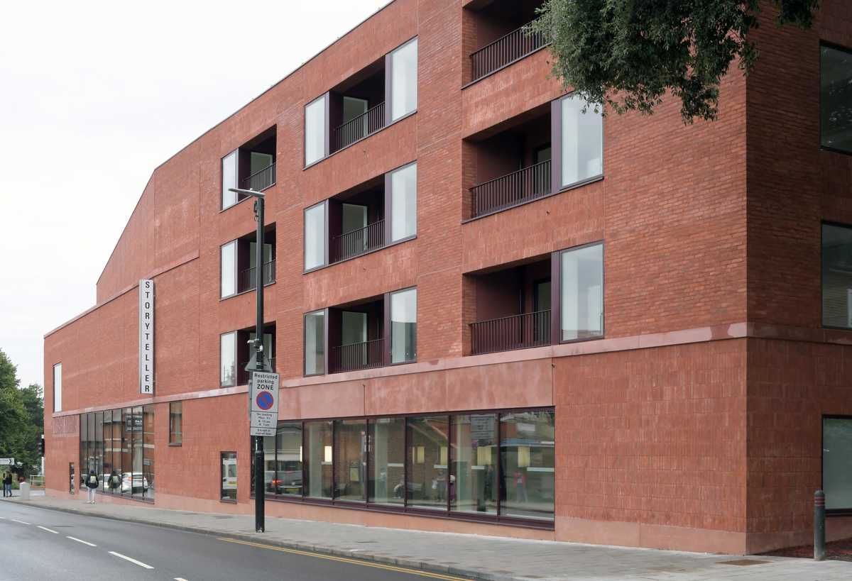 Narożna forma budynku płynnie łączy architekturę z elementami zieleni miejskiej, tworząc harmonijne przejście pomiędzy intensywną zabudową a przestrzenią przyjazną pieszym. Ceglany materiał elewacji koresponduje z historycznym charakterem okolicy, a duże przeszklenia otwierają obiekt na otoczenie, wzmacniając relację między architekturą a życiem miasta.