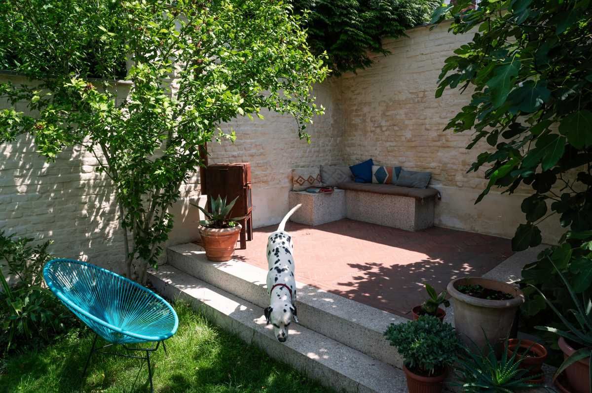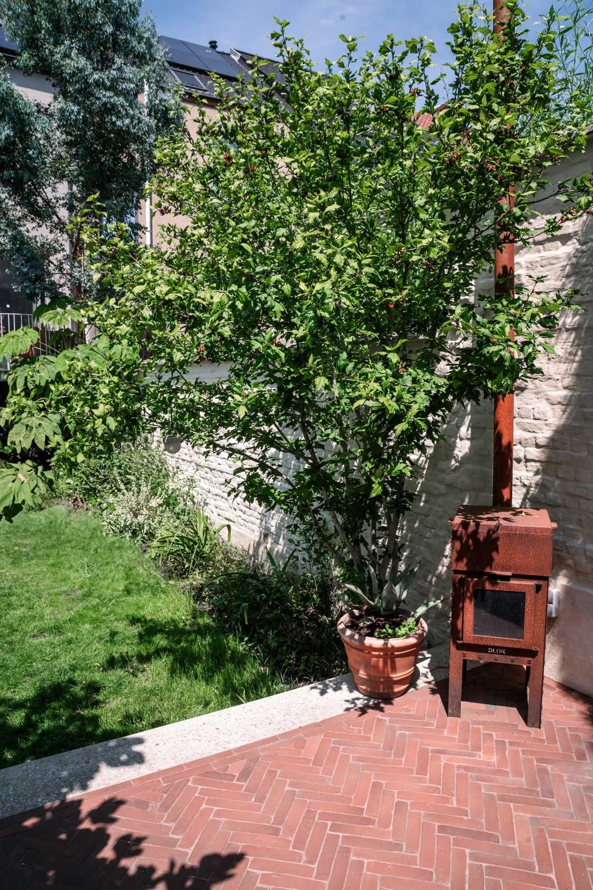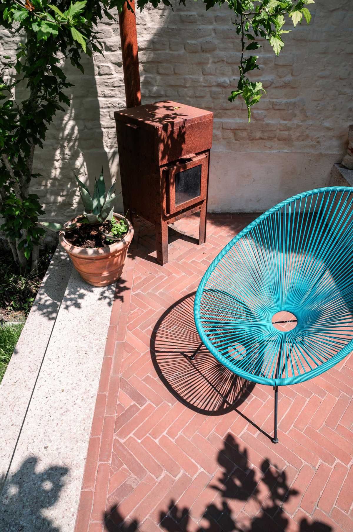 Przestrzeń ogrodowa, w której cegła, zieleń i światło tworzą harmonijną oazę relaksu.