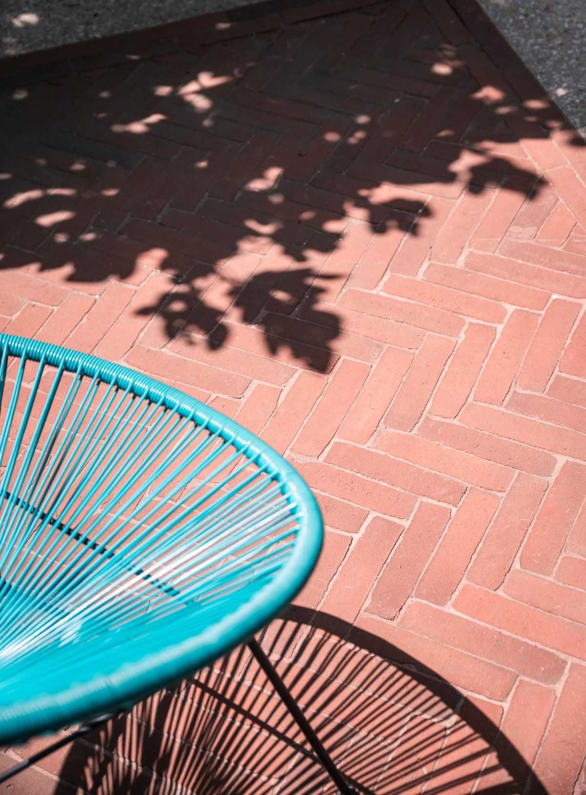 Realizacja opiera się na trwałej, ceglanej posadzce ułożonej w klasyczny wzór jodełki, który zapewnia zarówno wysoką odporność użytkową, jak i estetyczną spójność z naturalnym otoczeniem. Jasna, nieregularnie fakturowana cegła ogrodzeniowa tworzy tło podkreślające zieleń roślin, a zastosowane materiały cechują się odpornością na warunki atmosferyczne i łatwością utrzymania. Przestrzeń zaprojektowano tak, aby łączyć wygodę użytkowania z ponadczasowym wyglądem – od stabilnych stopni z betonu płukanego po zintegrowane miejsce do siedzenia. To funkcjonalny i estetyczny układ, idealny dla inwestorów poszukujących solidnych rozwiązań z wykorzystaniem cegły w aranżacjach ogrodowych.