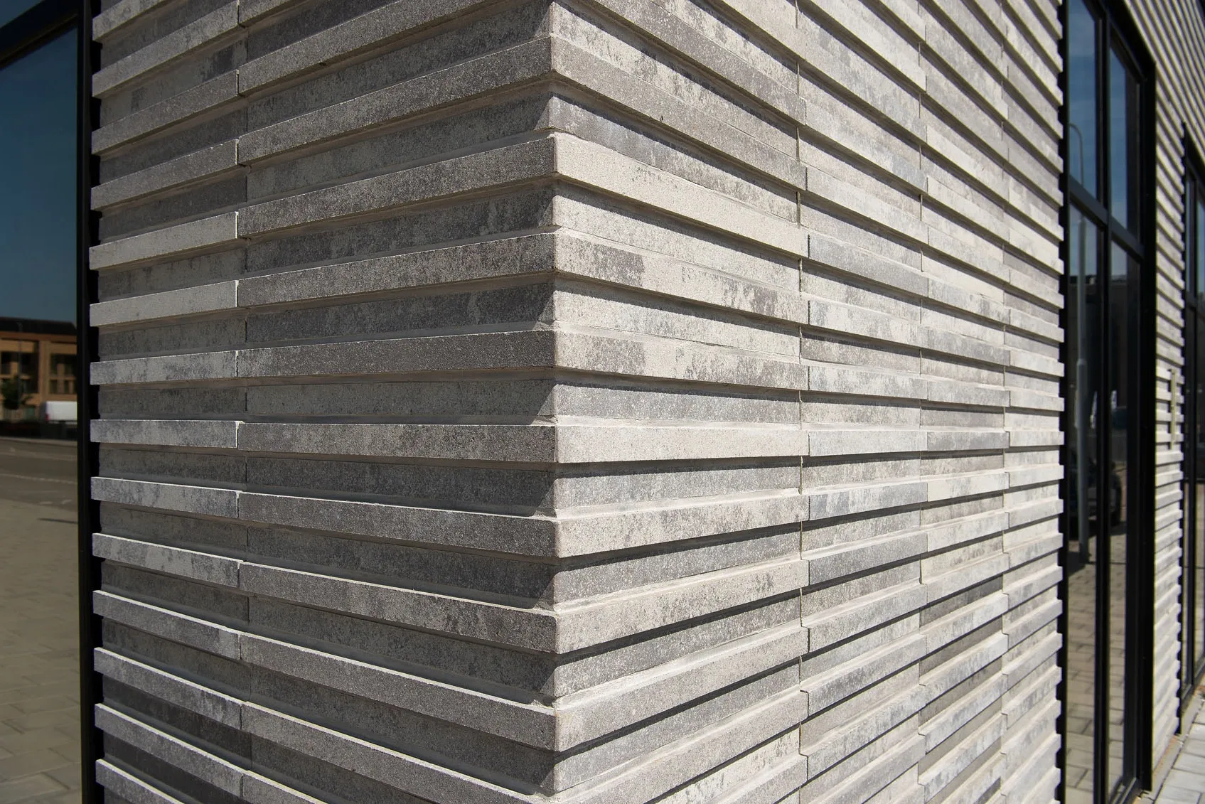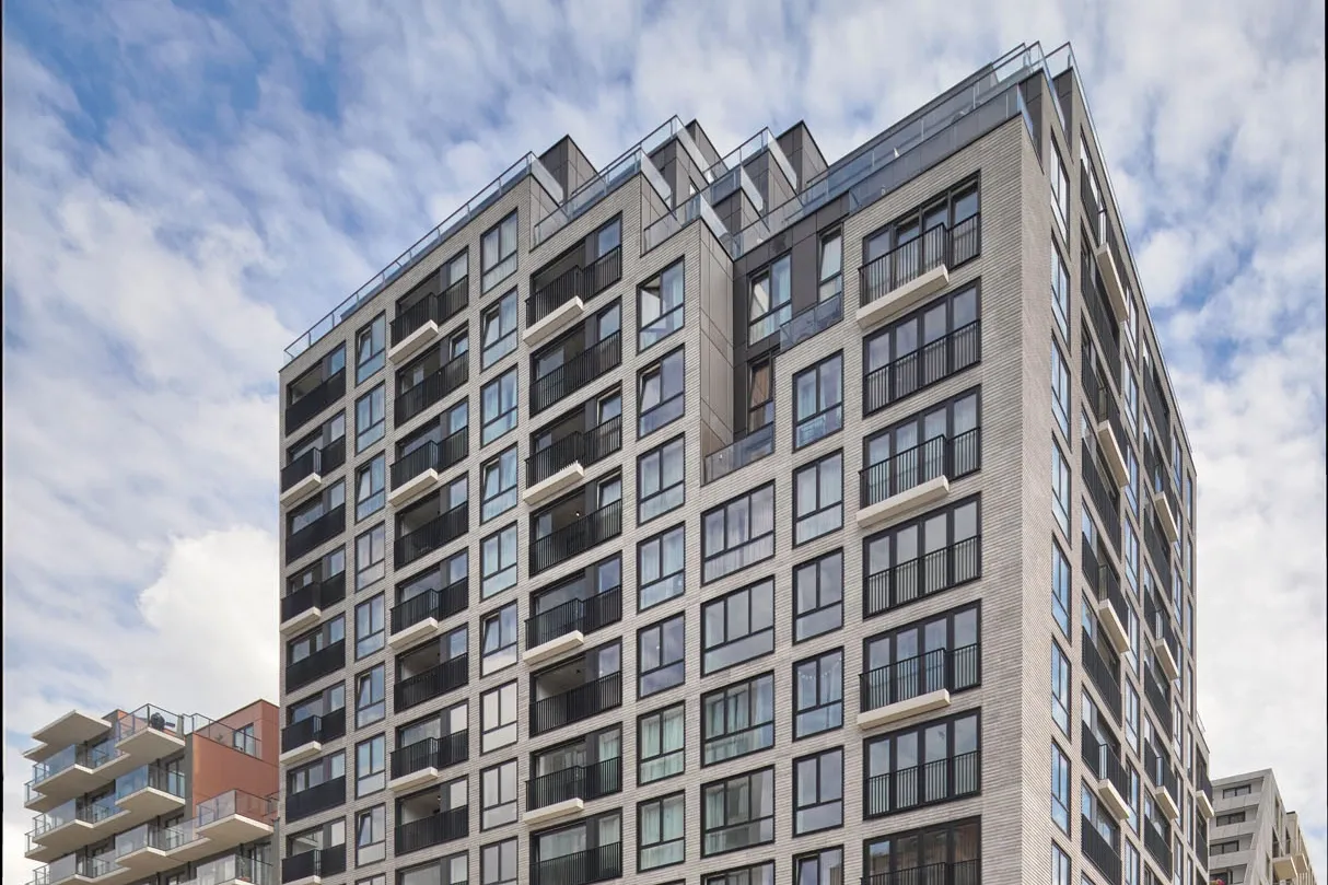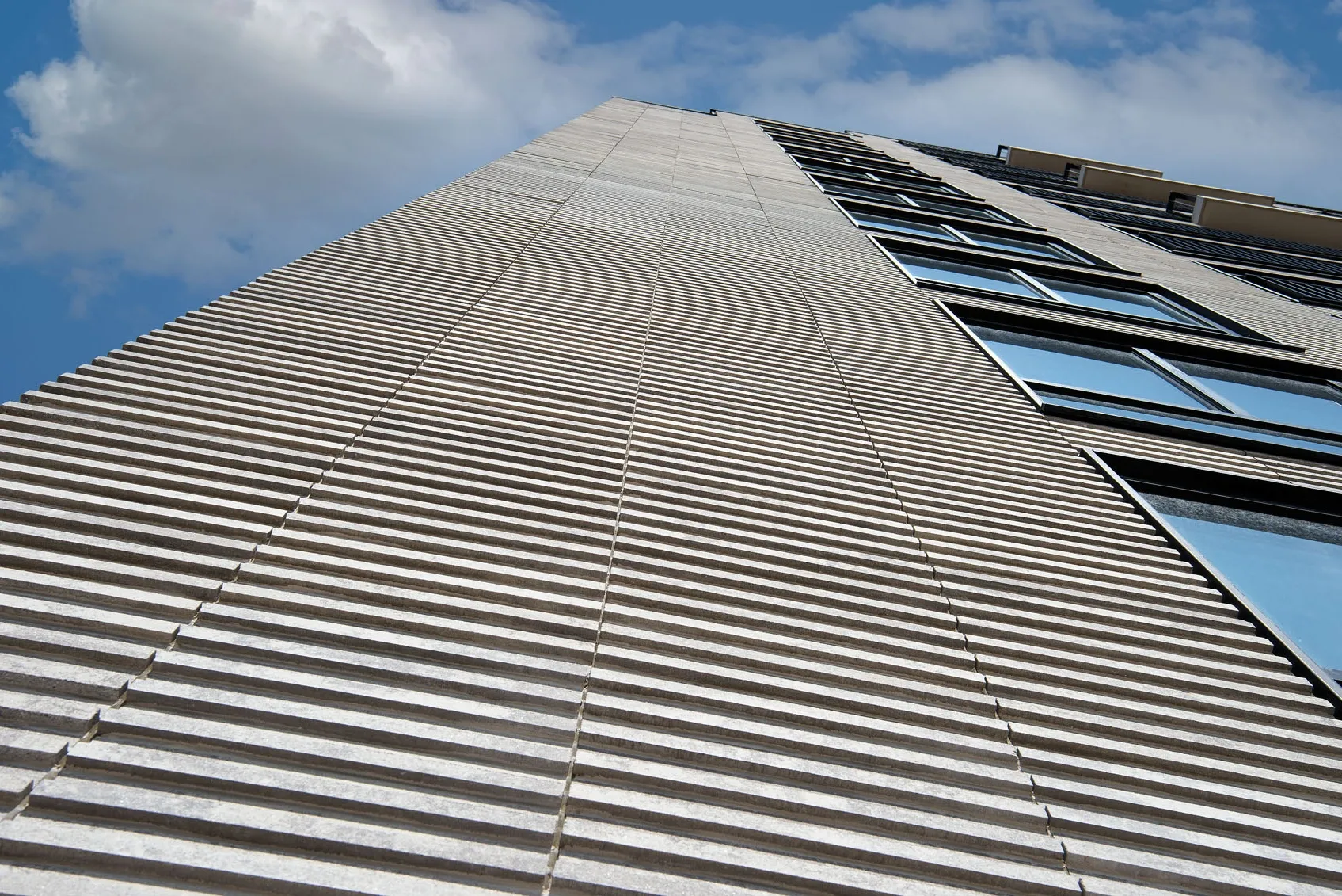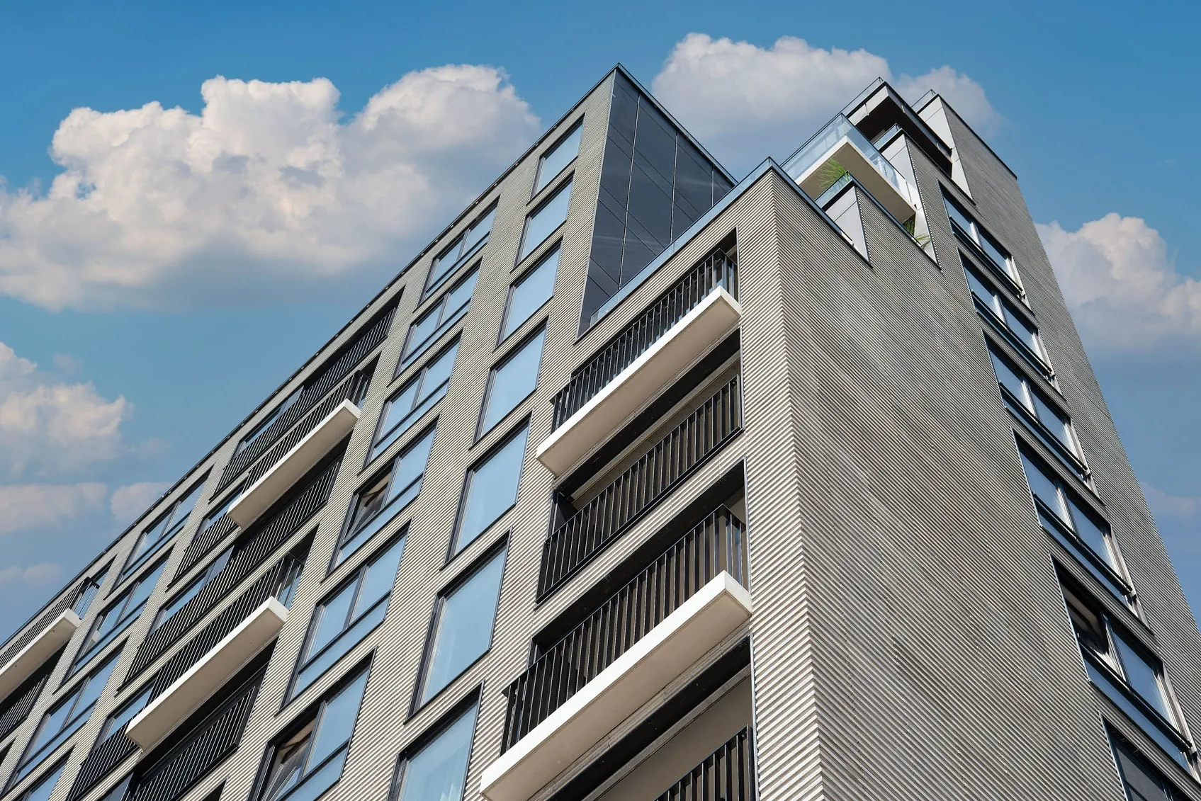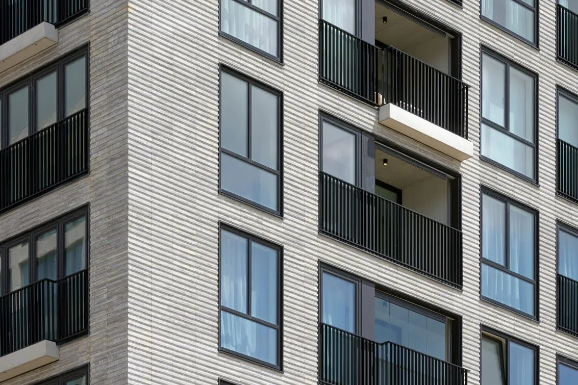 Projekt wyróżnia się precyzyjnie opracowaną fasadą, w której zastosowano smukłe, trójwymiarowe płytki o wyrazistej strukturze. Materiał ten nie tylko wzmacnia odporność elewacji, lecz także wprowadza elegancką fakturę podkreślającą wertykalny układ okien i balkonów. Zestawienie jasnych tonów z ciemną stolarką tworzy mocny, nowoczesny kontrast, charakterystyczny dla współczesnych realizacji mieszkaniowych. Efekt końcowy to architektura o wysokiej estetyce, łącząca funkcjonalność z wyrazistym designem.