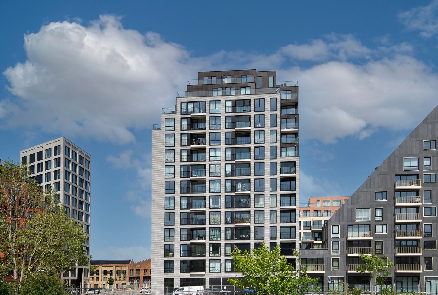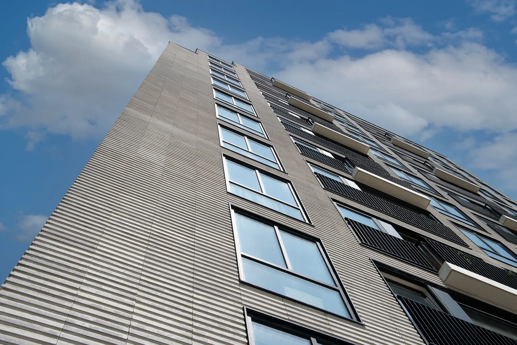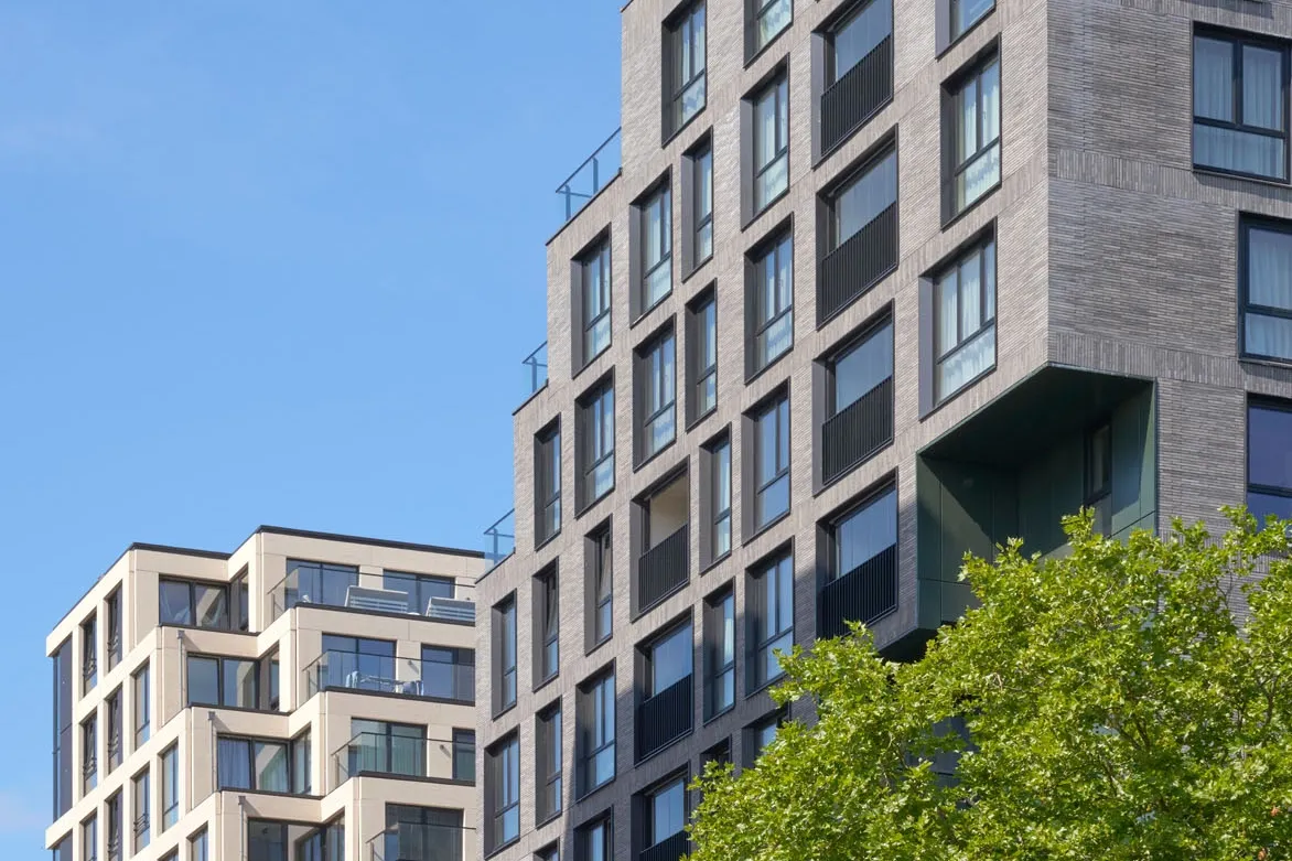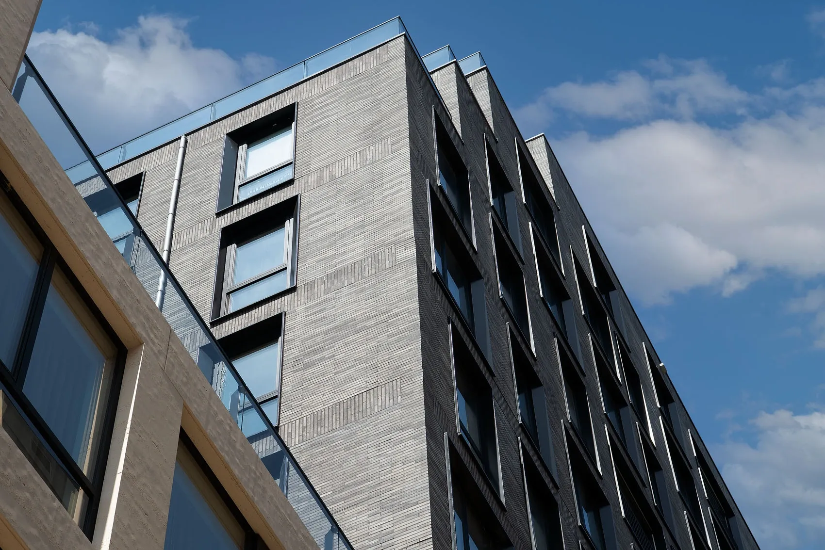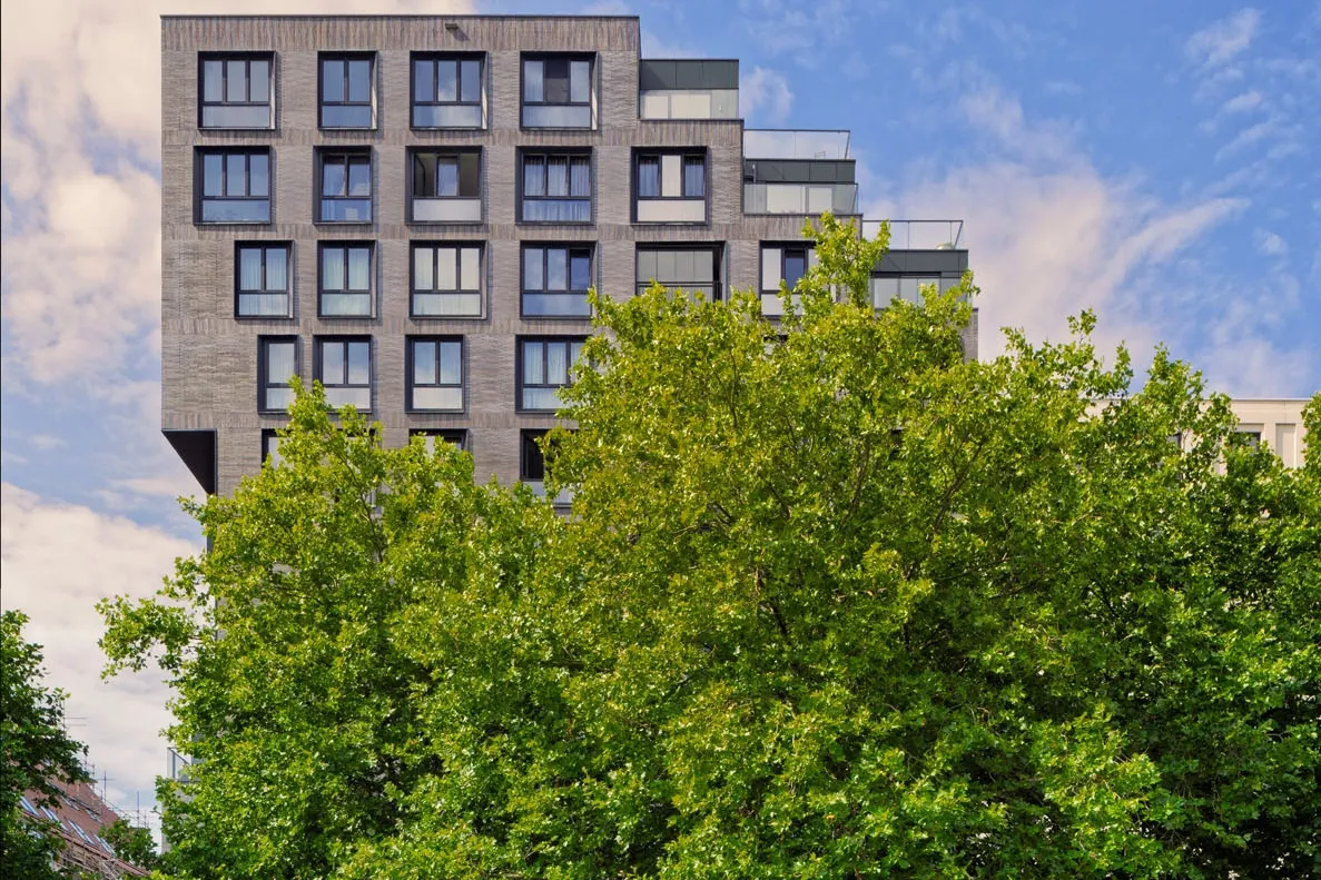 Projekt wyróżnia się precyzyjnie opracowaną fasadą, w której zastosowano smukłe, trójwymiarowe płytki o wyrazistej strukturze. Materiał ten nie tylko wzmacnia odporność elewacji, lecz także wprowadza elegancką fakturę podkreślającą wertykalny układ okien i balkonów. Zestawienie jasnych tonów z ciemną stolarką tworzy mocny, nowoczesny kontrast, charakterystyczny dla współczesnych realizacji mieszkaniowych. Efekt końcowy to architektura o wysokiej estetyce, łącząca funkcjonalność z wyrazistym designem.