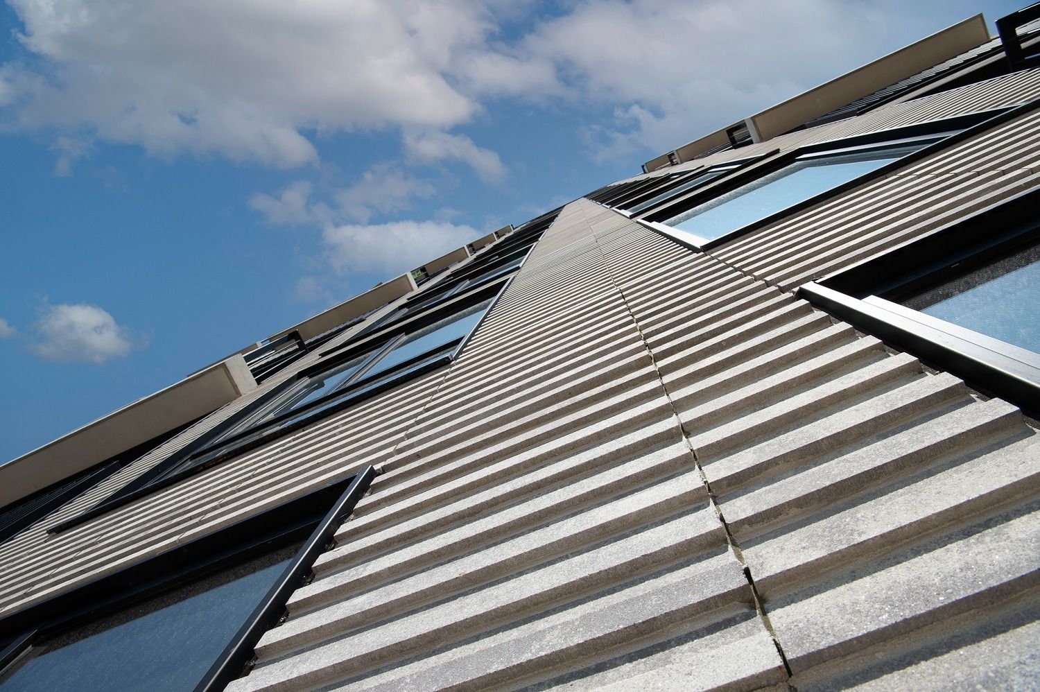 Elewacja budynku została zaprojektowana z myślą o uzyskaniu dynamicznego, a jednocześnie minimalistycznego efektu wizualnego. Rytmicznie ułożone, poziome płytki elewacyjne tworzą ciekawą grę światła i cienia, która zmienia się w ciągu dnia. Jasnoszara kolorystyka dodaje lekkości masywnej bryle, a duże przeszklenia harmonijnie przełamują jej geometryczną regularność. Całość podkreśla nowoczesny charakter inwestycji i jej spójność z miejskim otoczeniem.