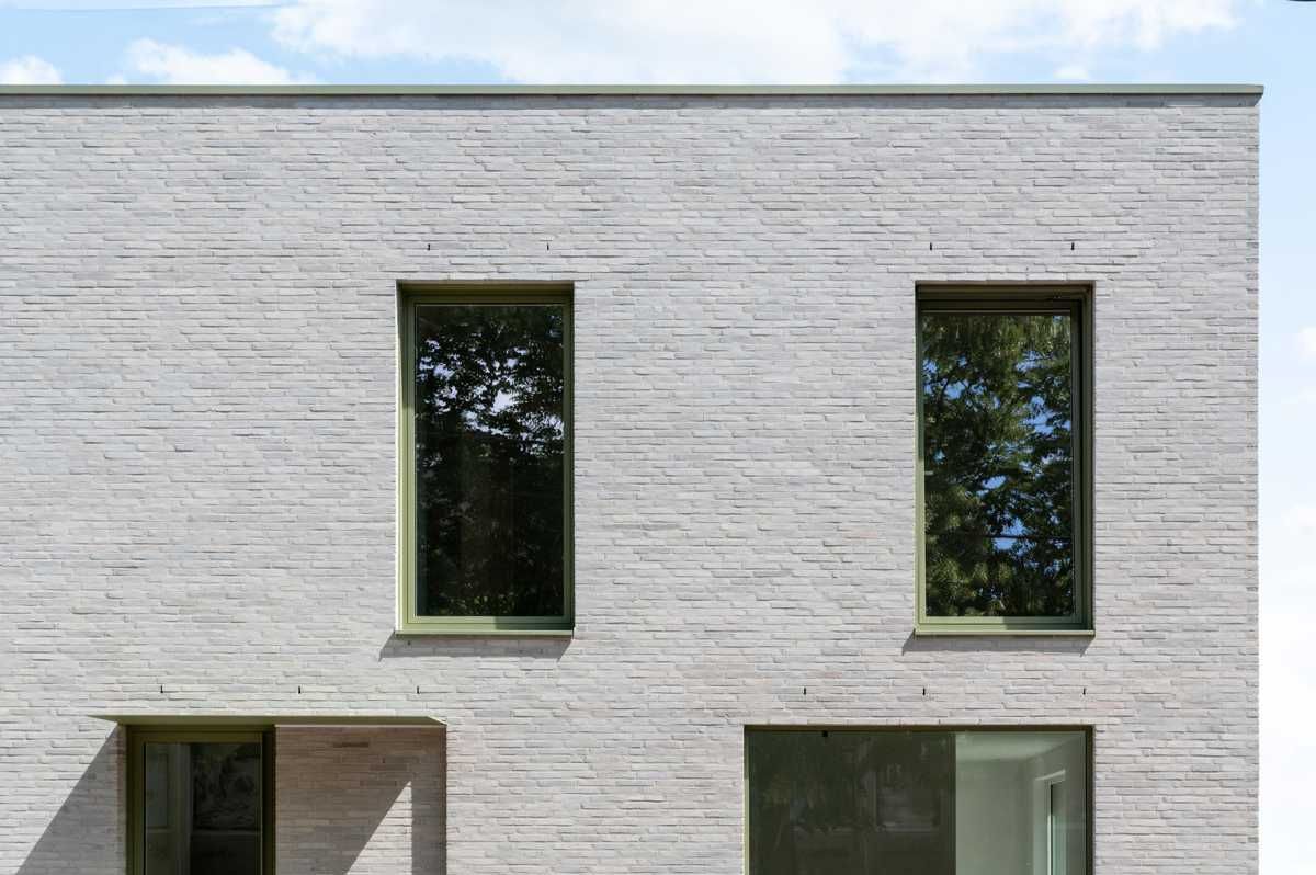 Realizacja prezentuje nowoczesną elewację wykonaną z jasnej cegły, która wyróżnia się subtelną fakturą i naturalną kolorystyką. Duże przeszklenia oraz zielone ramy okienne wprowadzają do projektu świeżość i lekki, współczesny charakter. To trwała i estetyczna cegła elewacyjna, idealna do realizacji nowoczesnych domów. Minimalistyczny detal i stonowana paleta materiałów podkreślają ponadczasową elegancję budynku.