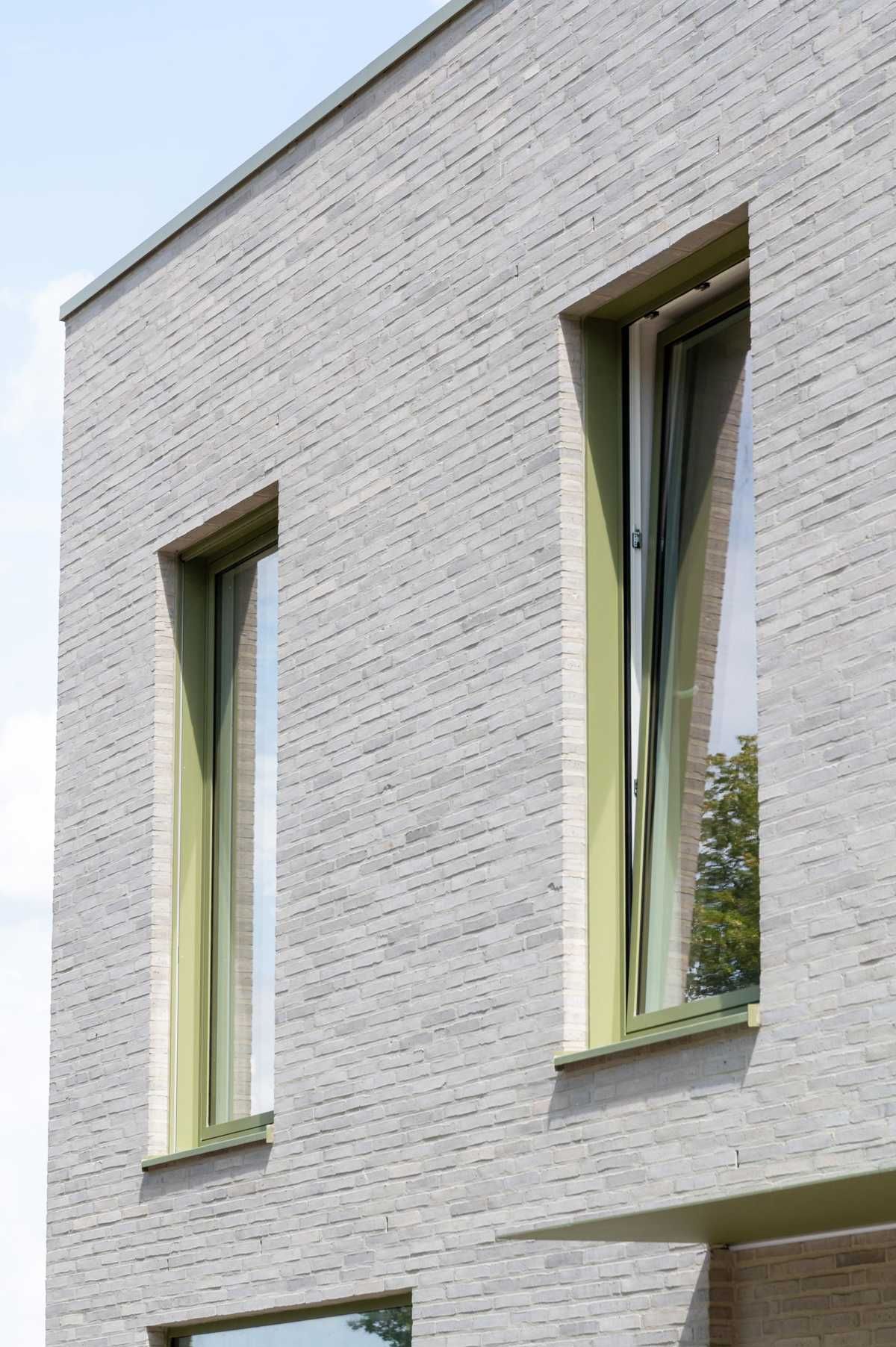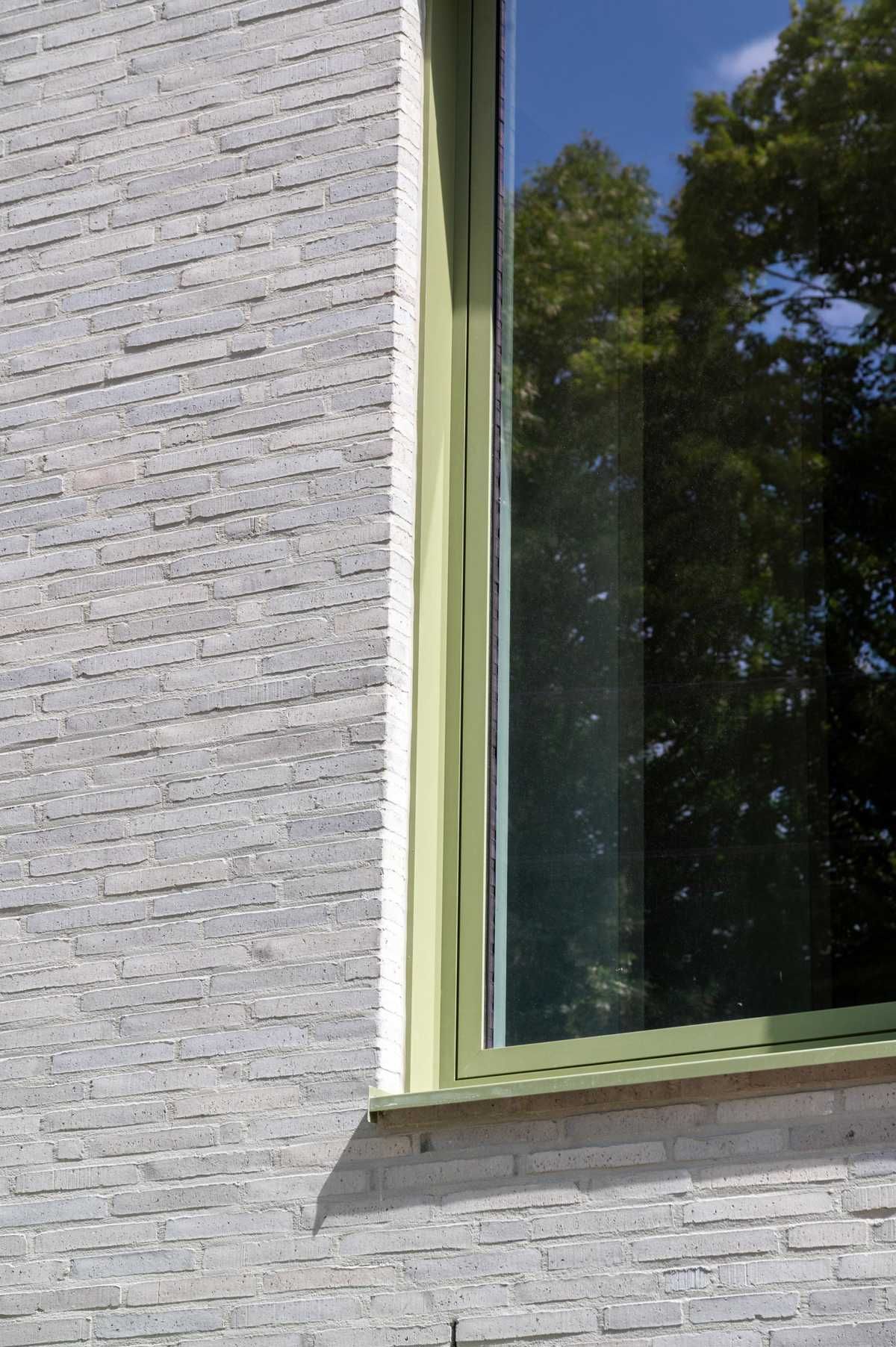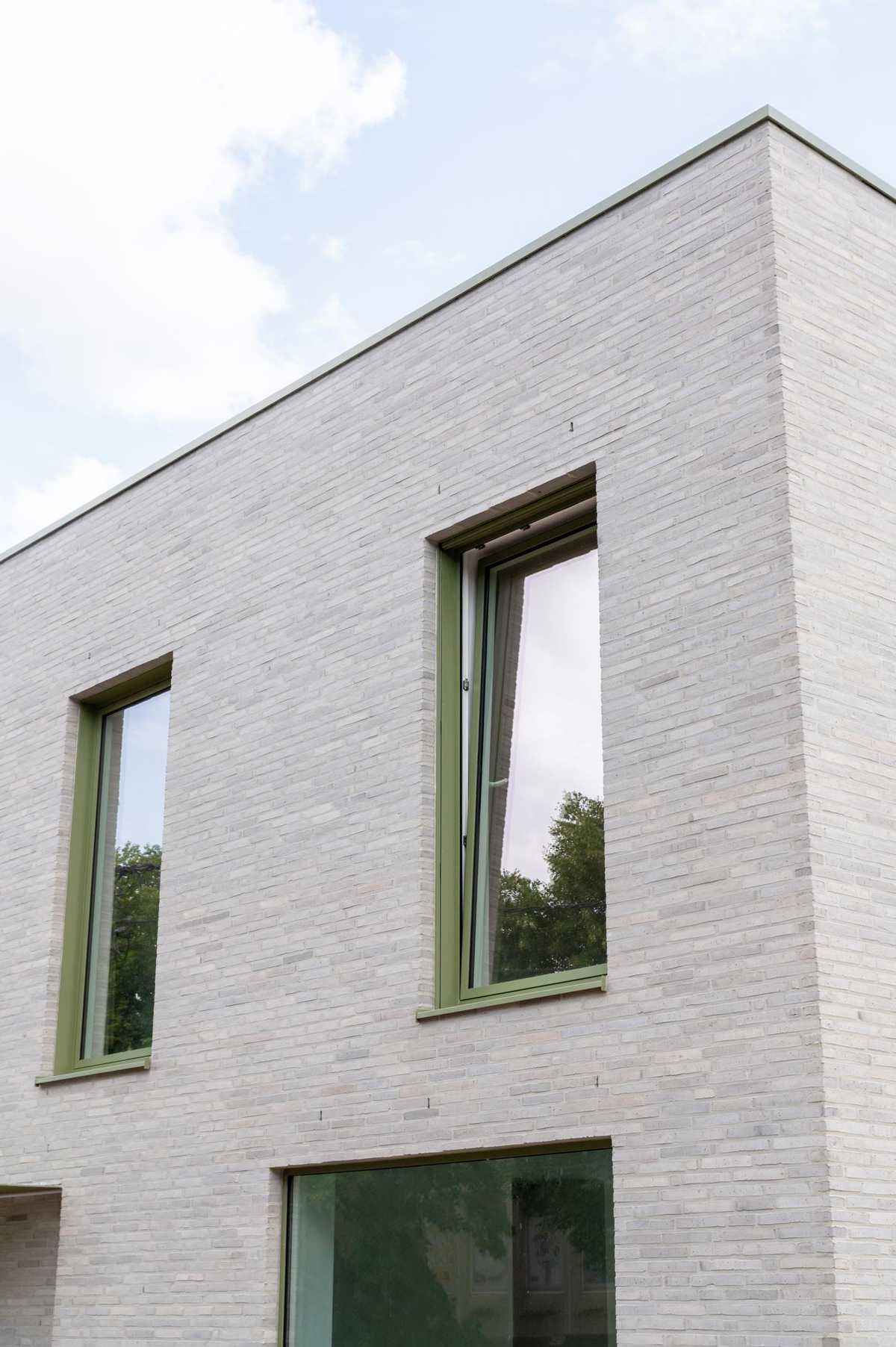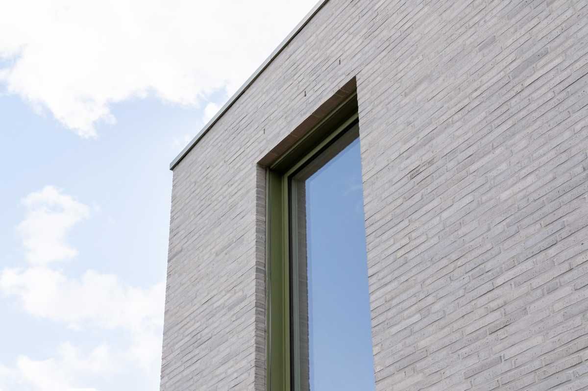 Elewacja z wąskiego formatu cegły układa się w spokojny, rytmiczny rysunek, który łagodnie prowadzi wzrok po bryle. Zieleń stolarki stanowi subtelny kontrapunkt dla jasnych cegieł, dodając całości głębi i charakteru. To architektura, która nie szuka efektu – ona buduje atmosferę.
