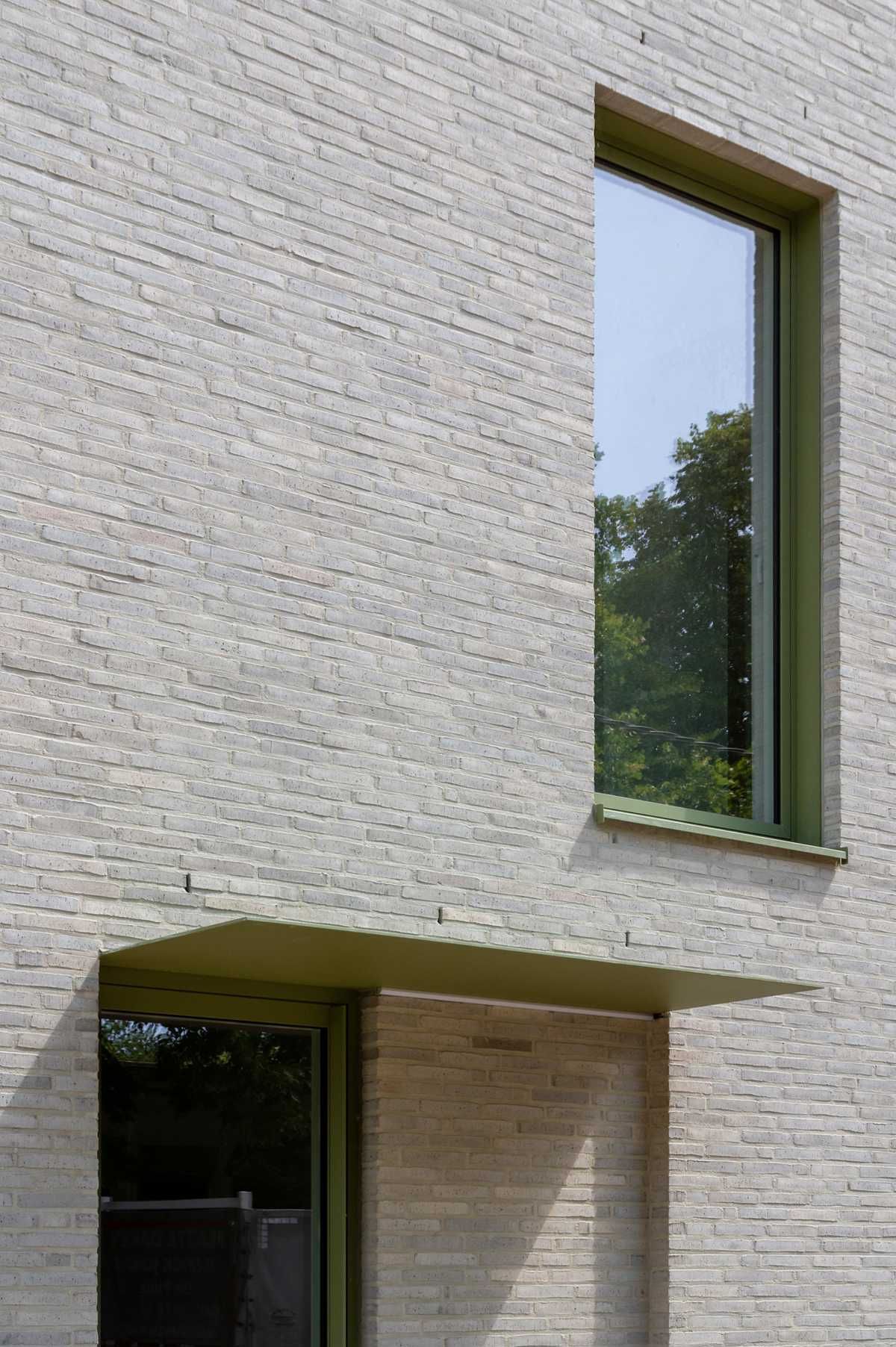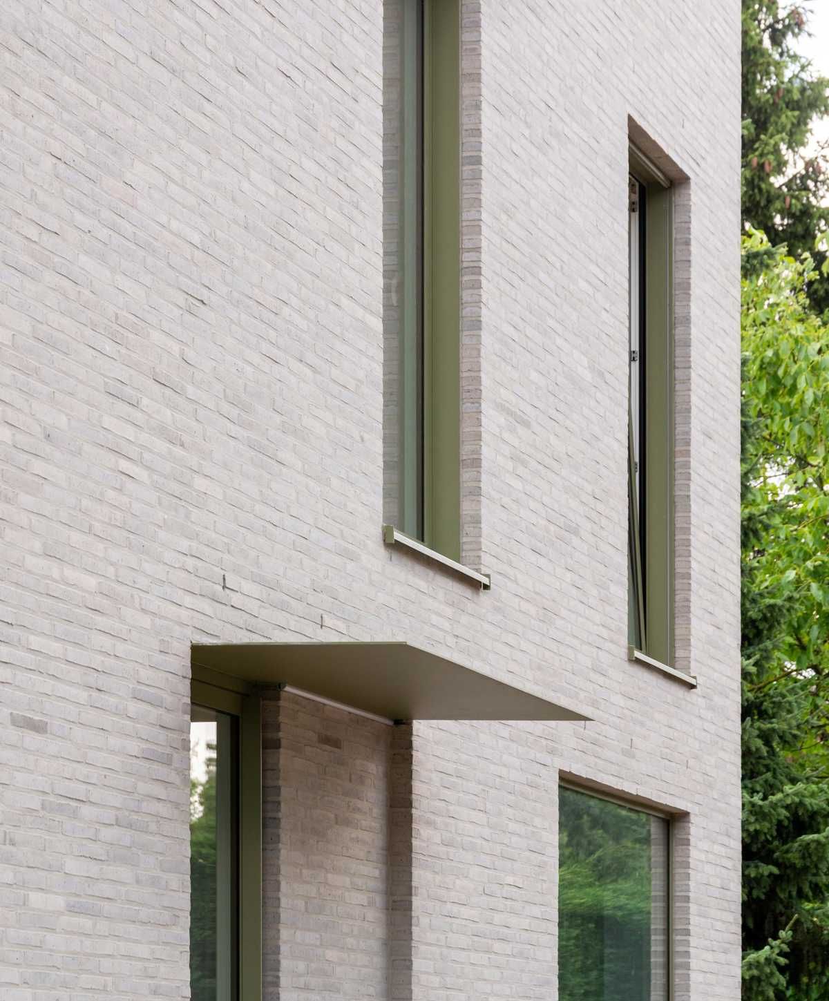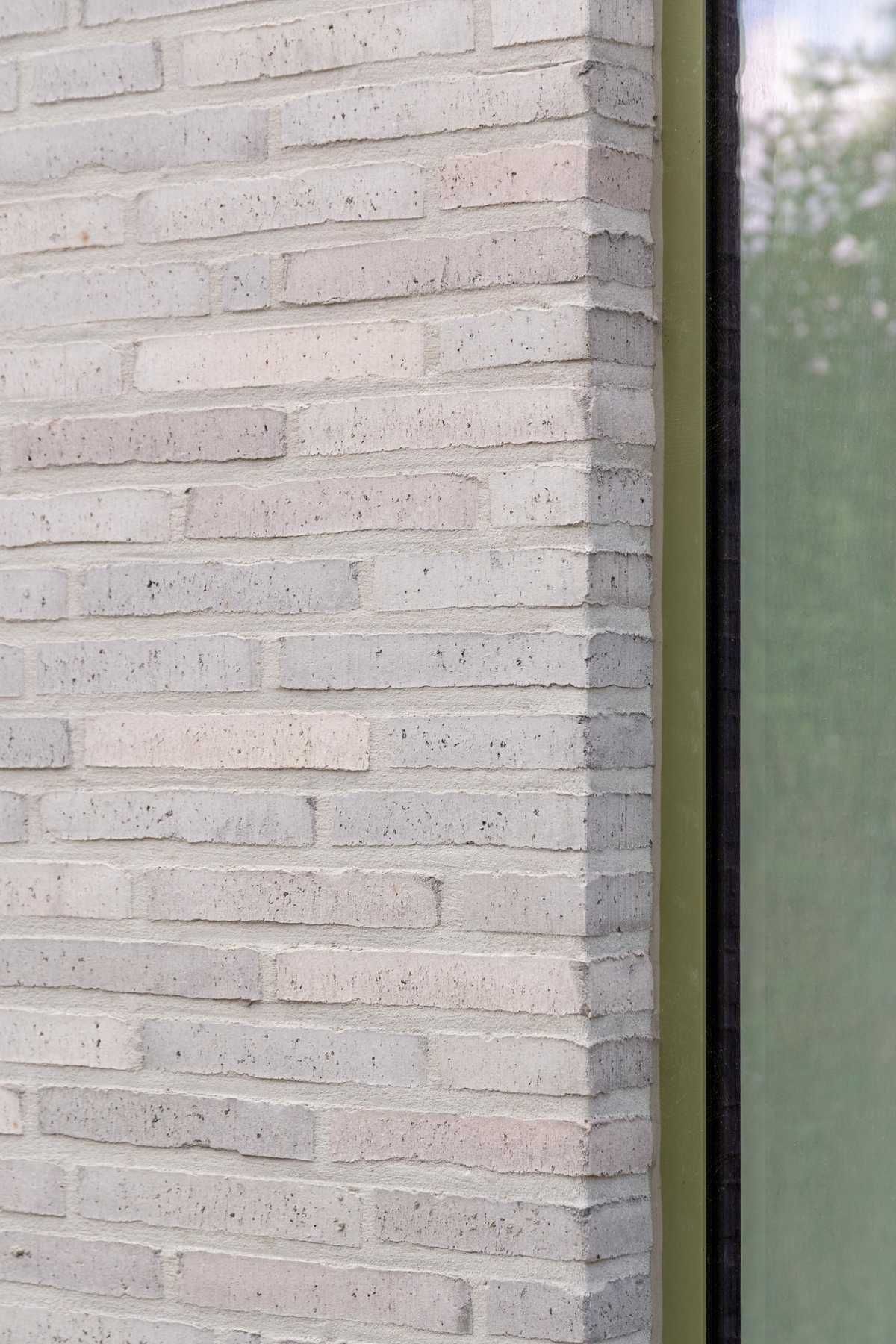 Elewacja z wąskiego formatu cegły układa się w spokojny, rytmiczny rysunek, który łagodnie prowadzi wzrok po bryle. Zieleń stolarki stanowi subtelny kontrapunkt dla jasnych cegieł, dodając całości głębi i charakteru. To architektura, która nie szuka efektu – ona buduje atmosferę.