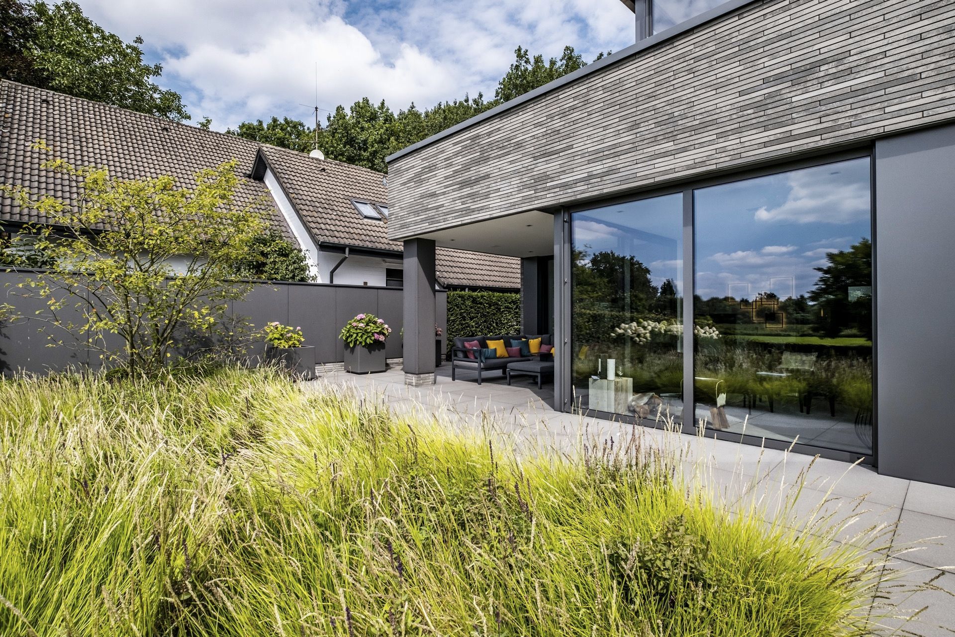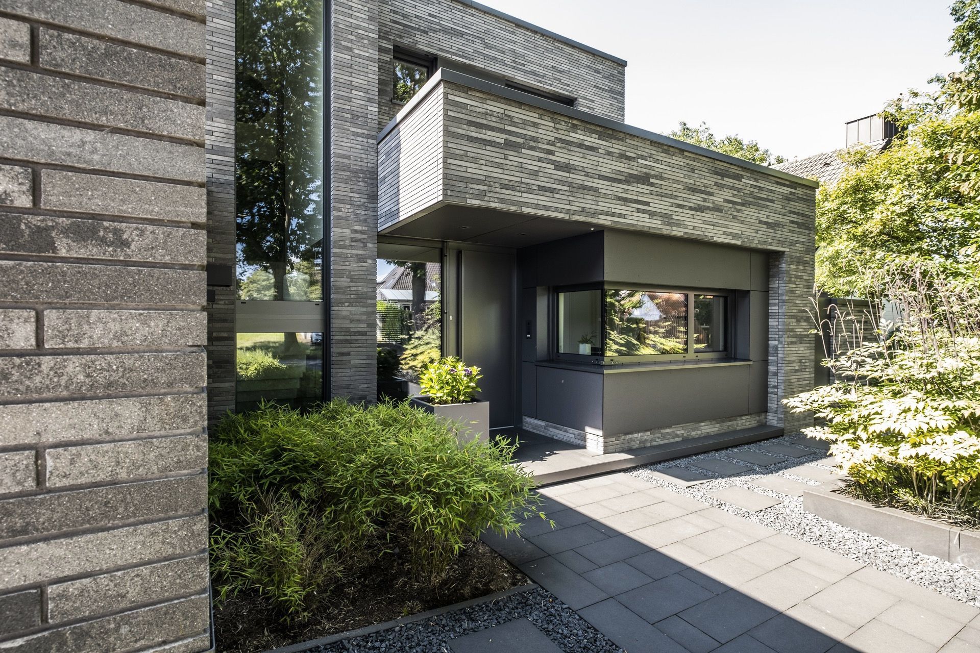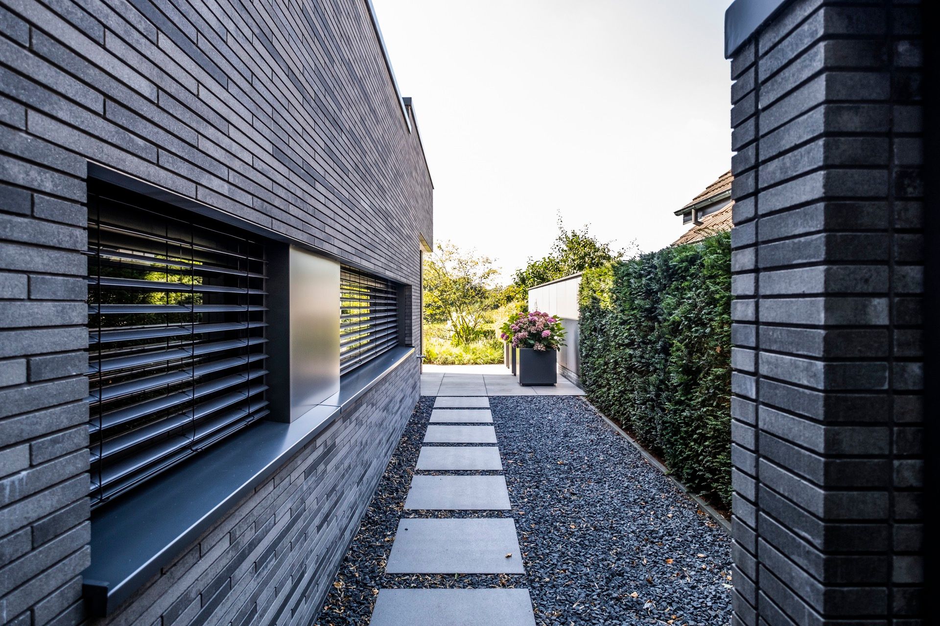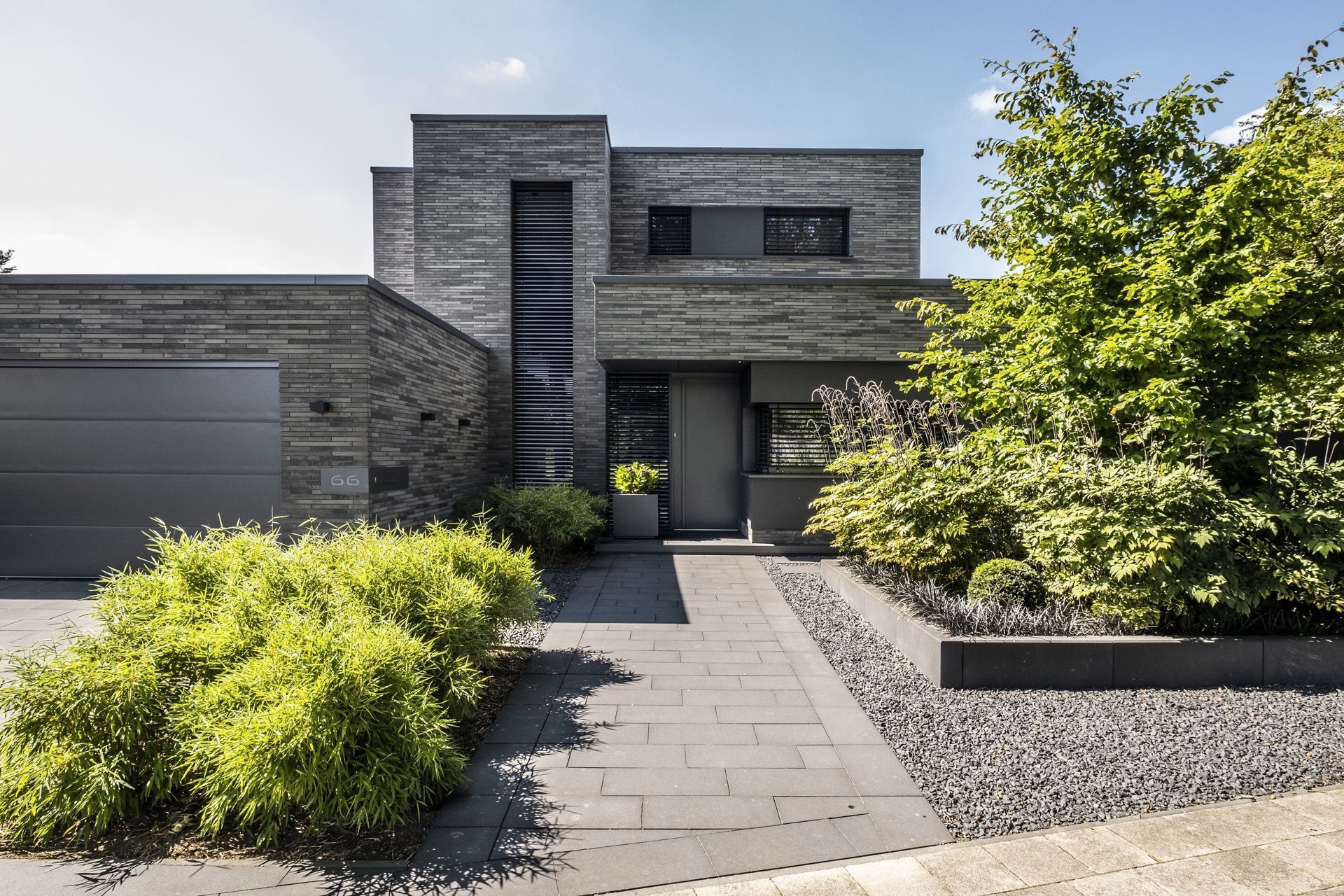 Budynek zaprojektowano jako sekwencję prostych, kubicznych brył o wyraźnej horyzontalnej kompozycji. Elewacja z ciemnej cegły klinkierowej buduje spójny, rytmiczny rysunek, który podkreśla geometrię formy i nadaje całości ponadczasowy charakter. Duże przeszklenia otwierają wnętrza na ogród, a cofnięcia brył tworzą strefy półprywatne i naturalne przejścia pomiędzy architekturą a zielenią. Starannie zaprojektowany krajobraz, minimalistyczne detale oraz konsekwentna praca materiałem składają się na spokojną, nowoczesną przestrzeń mieszkalną o wysokiej jakości architektonicznej.