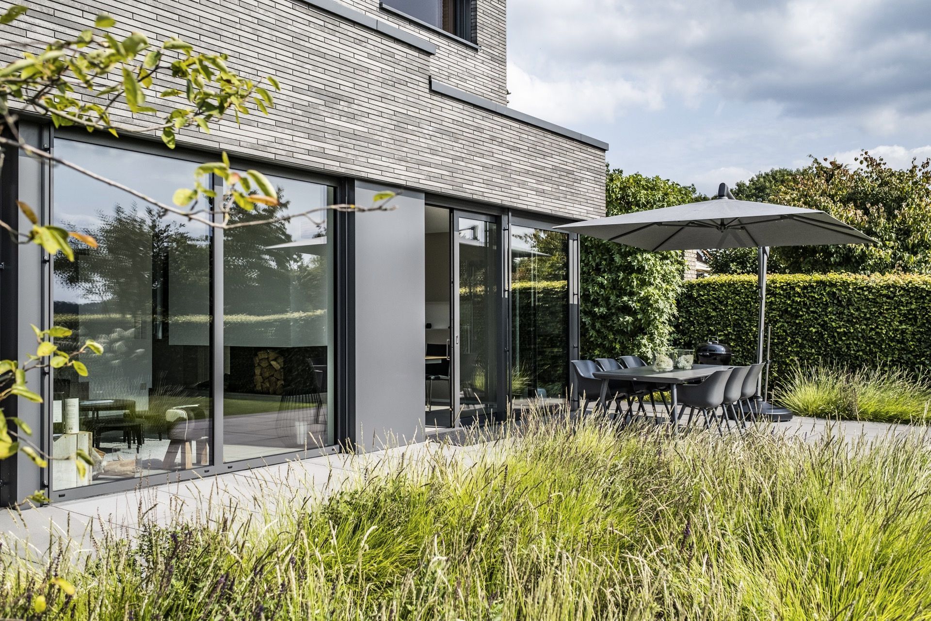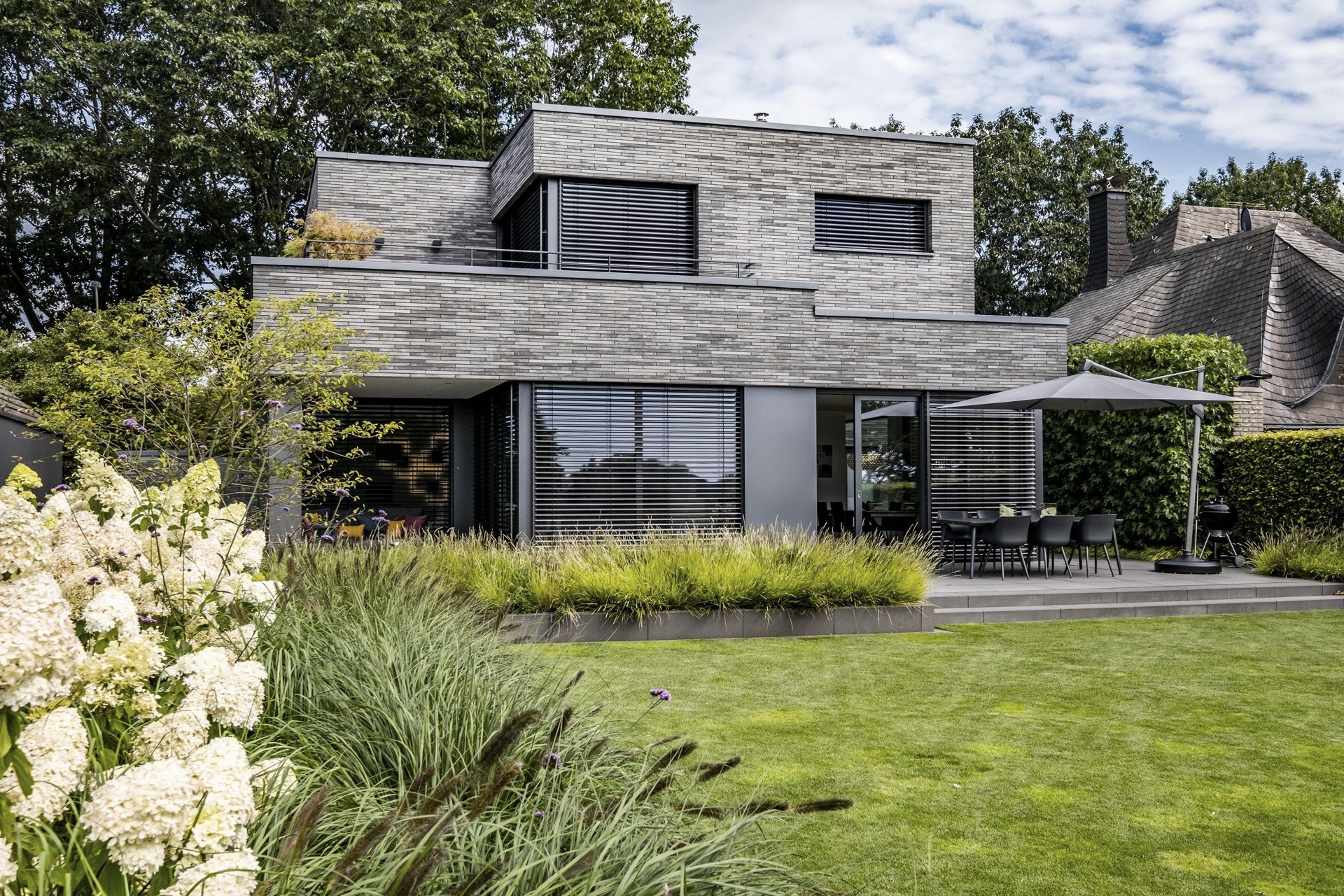 Nowoczesny dom zdefiniowany przez rytm cegły i zieleni