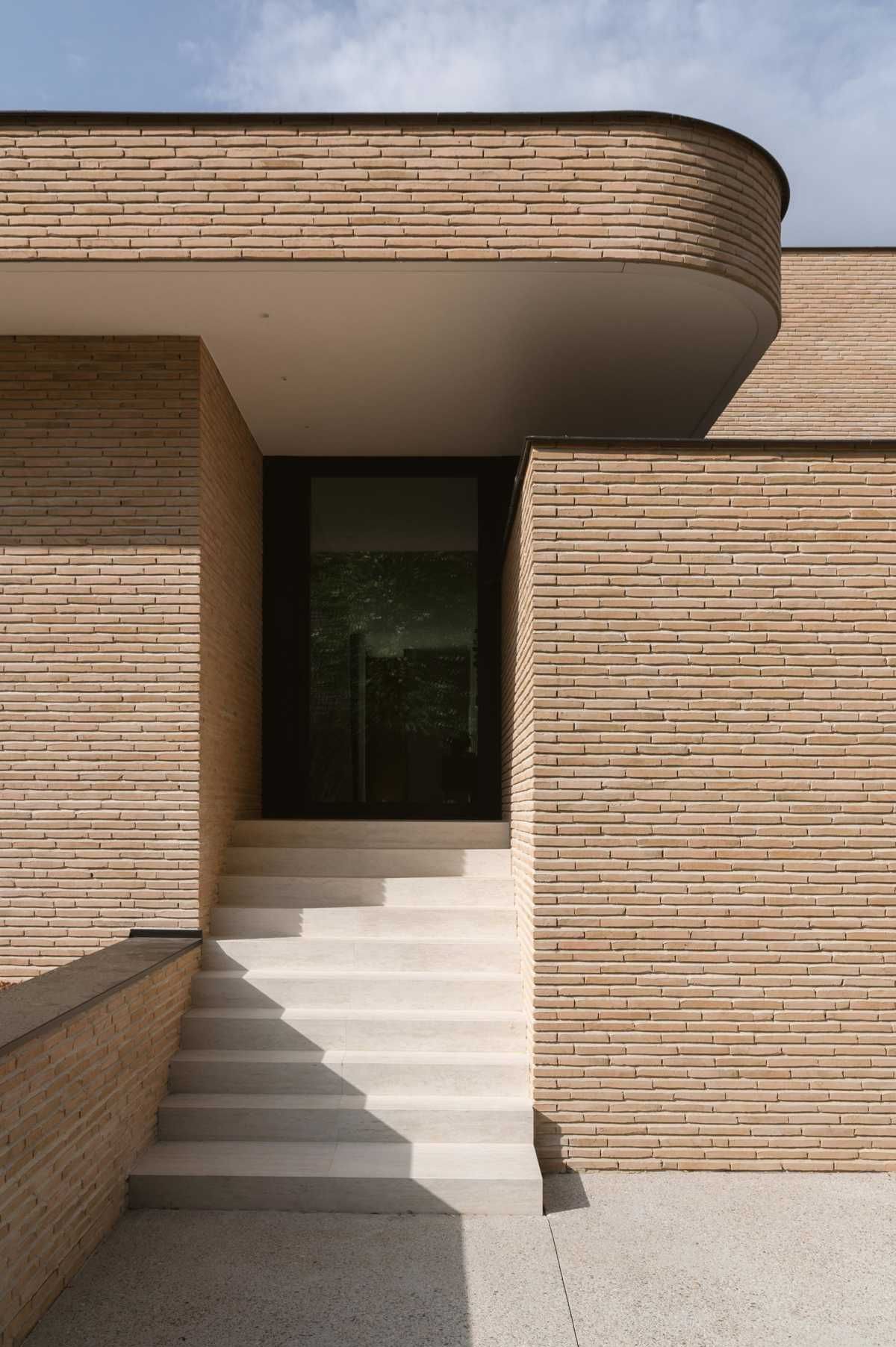 Bryła budynku została ukształtowana poprzez zestawienie prostych, horyzontalnych form z miękkimi zaokrągleniami narożników, które nadają całości lekkości i płynności. Jasna cegła klinkierowa zastosowana na elewacji podkreśla rysunek murów i naturalną fakturę materiału, jednocześnie ocieplając nowoczesny charakter architektury. Duże przeszklenia oraz płynne przejścia między wnętrzem a strefami zewnętrznymi wzmacniają relację budynku z otoczeniem, a starannie zaprojektowane detale betonowe dopełniają kompozycję spójną i wyważoną.