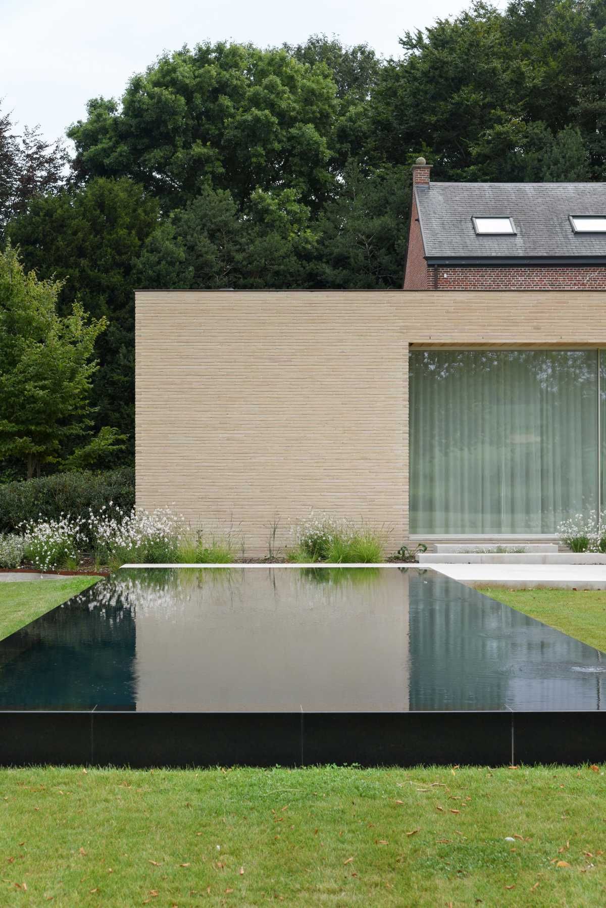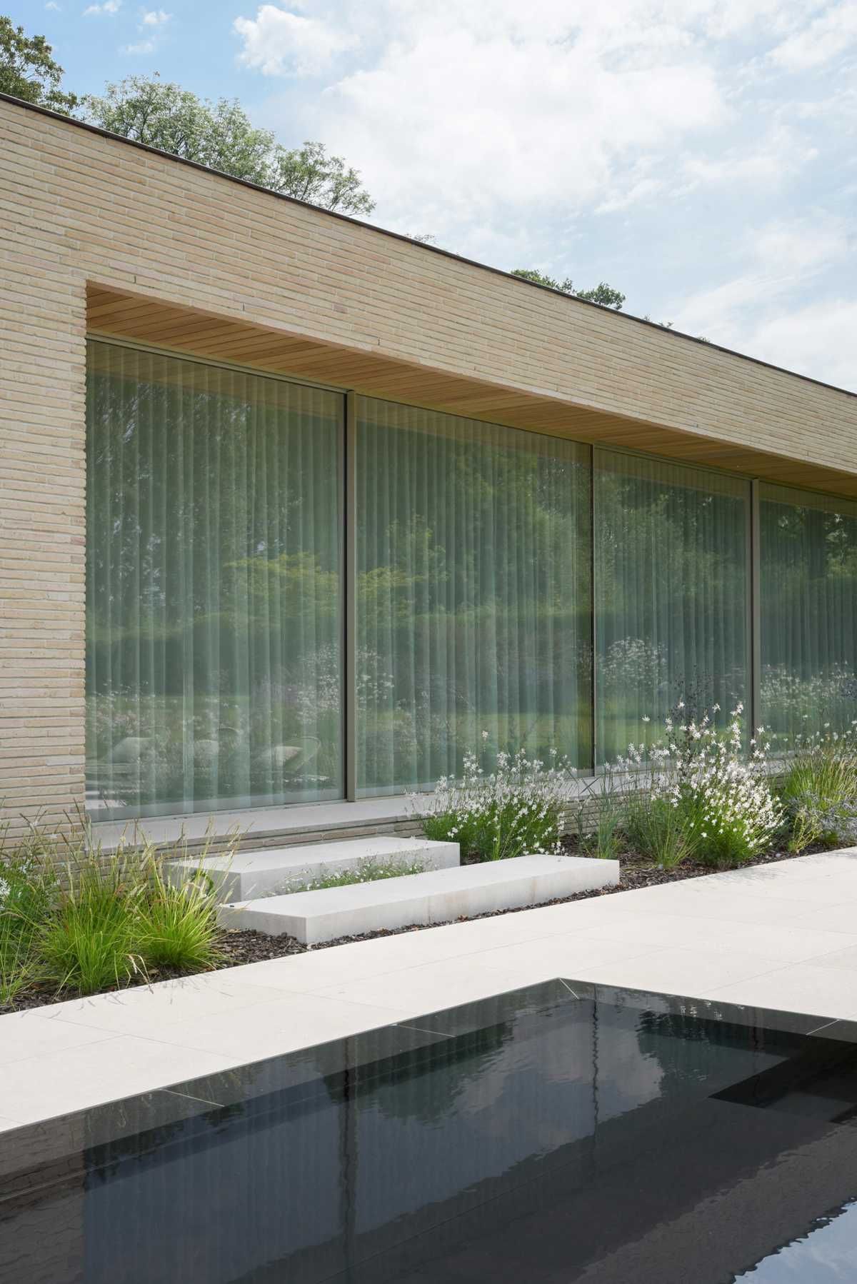 Elewację wykonano z cegły longformat w odcieniu beżu, co nadaje budynkowi elegancki, horyzontalny charakter. Wydłużony format cegły podkreśla minimalistyczną geometrię bryły, a subtelna kolorystyka harmonizuje z naturalnym otoczeniem. Precyzyjny, poziomy układ murów tworzy spójne, linearne lico, stanowiące trwałe i estetyczne tło dla dużych przeszkleń oraz starannie zaprojektowanych przestrzeni ogrodowych.
