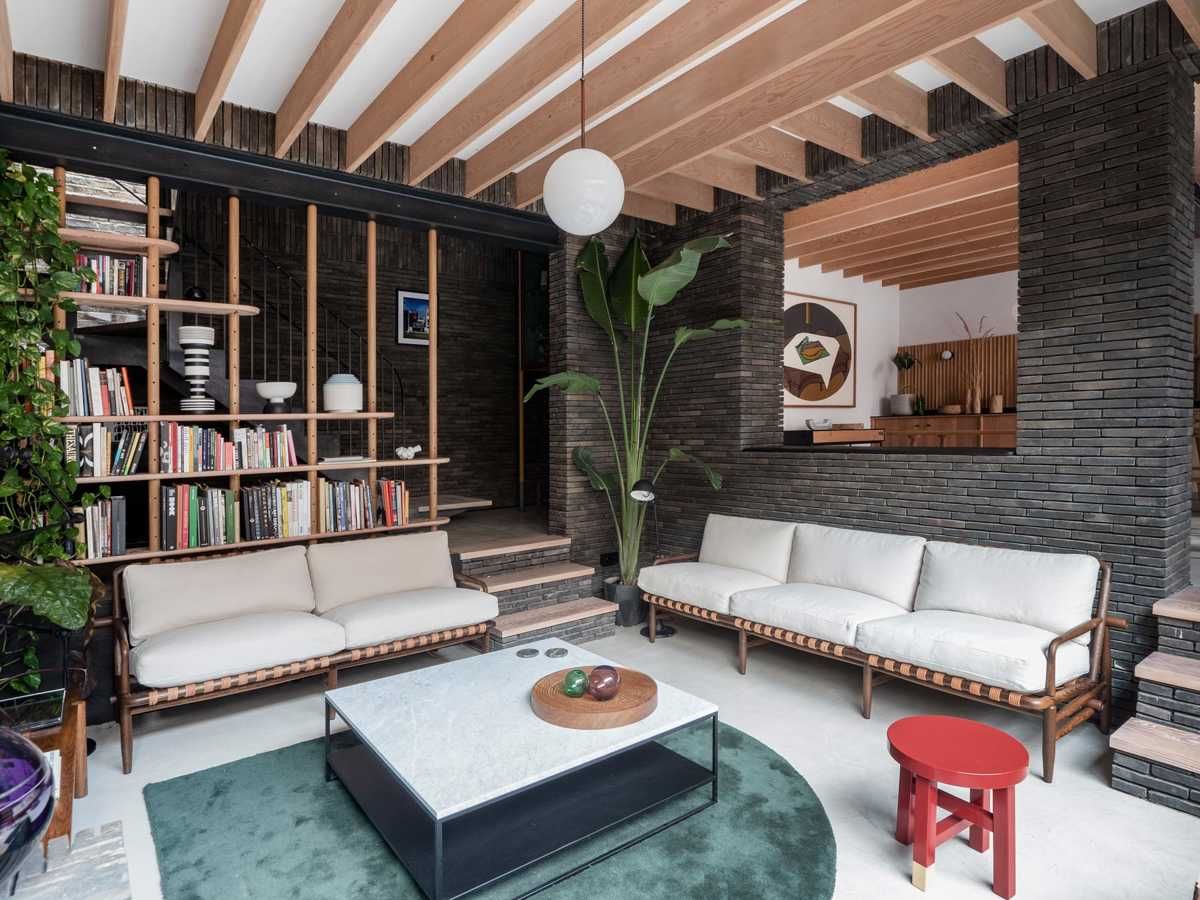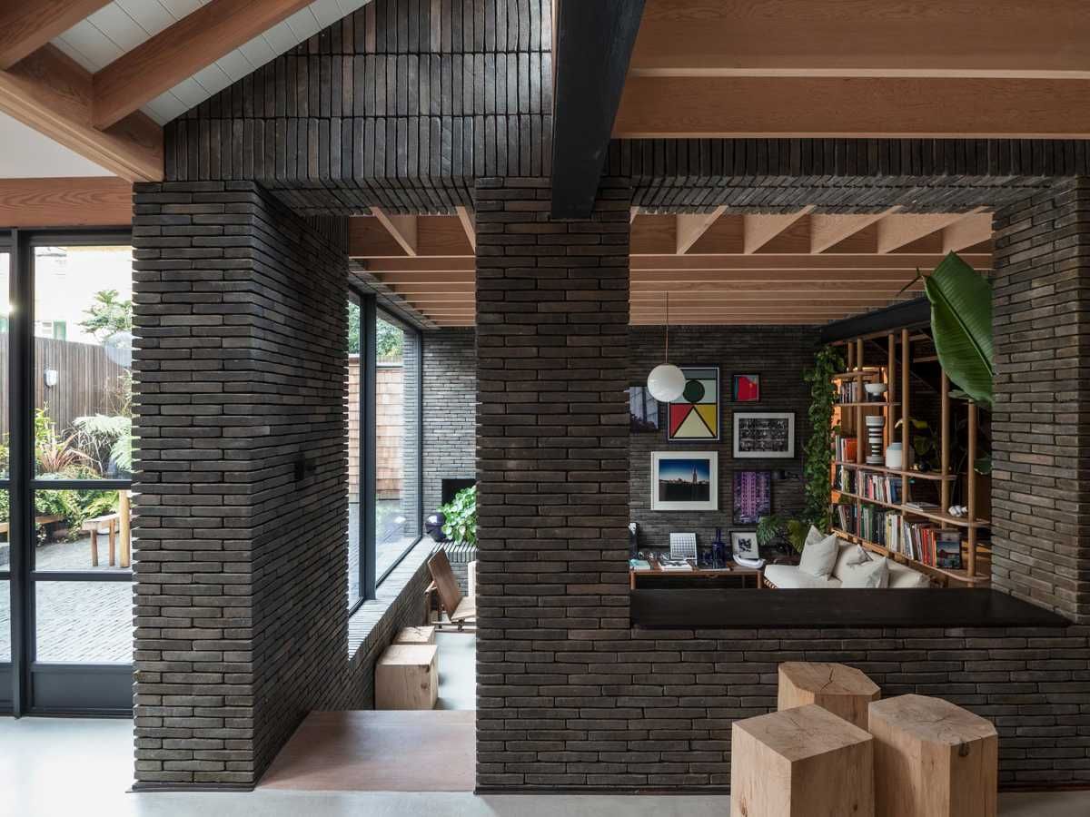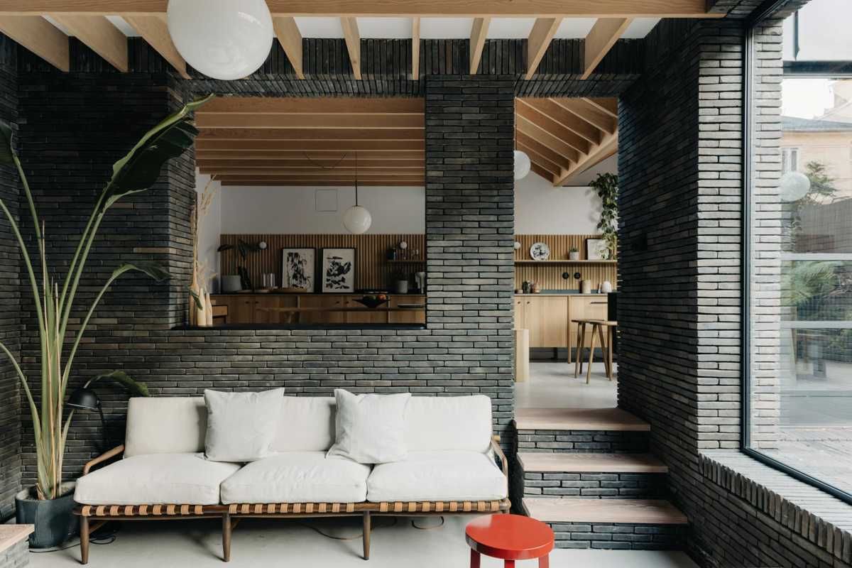 To wnętrze udowadnia, że cegła może być czymś znacznie więcej niż tylko materiałem elewacyjnym — staje się tu pełnoprawnym elementem architektury wnętrz, nadającym przestrzeni charakter, rytm i głębię. Ciemna, smukła cegła o subtelnej, niemal satynowej fakturze oplata cały dom niczym szlachetna tkanina, tworząc spójną kompozycję z naturalnym drewnem, światłem i minimalistycznym wyposażeniem.