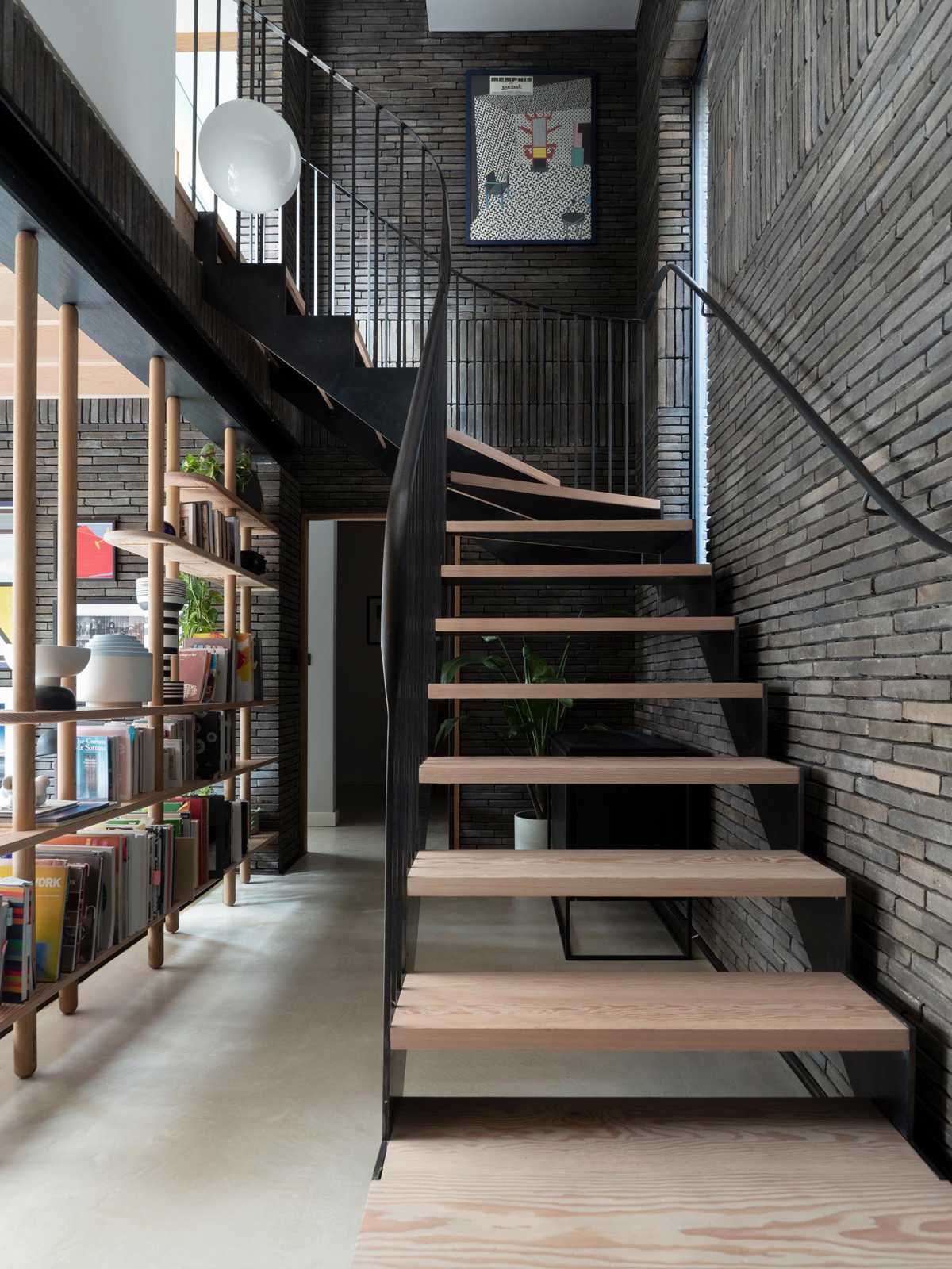 Jej linearna forma podkreśla proporcje i prowadzi wzrok przez kolejne strefy domu, delikatnie definiując przestrzeń bez potrzeby wyraźnych podziałów. W kuchni ciemna cegła tworzy eleganiczne tło dla jasnego drewna i wysokiej, otwartej więźby dachowej, wzmacniając wrażenie lekkości i architektonicznego porządku. Z kolei przy schodach współpracuje z metalową balustradą i rytmem półek, tworząc płynne przejścia między poziomami i dodając wnętrzu głębi.