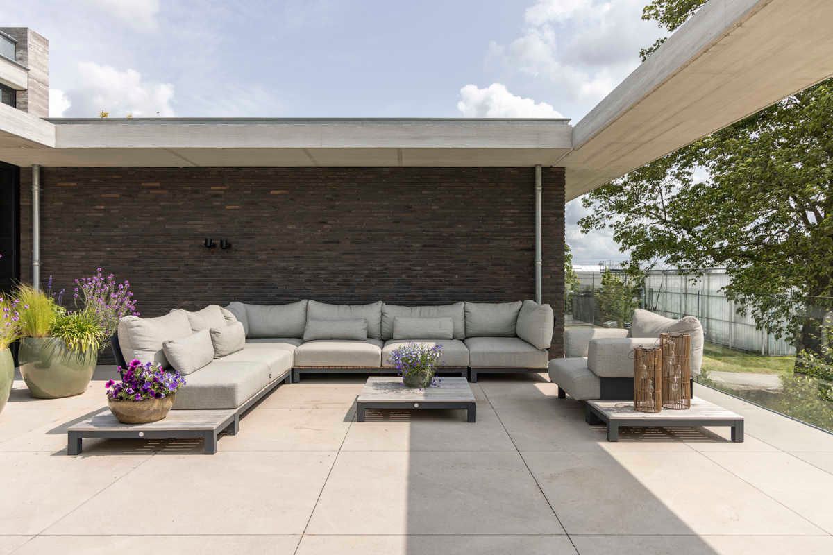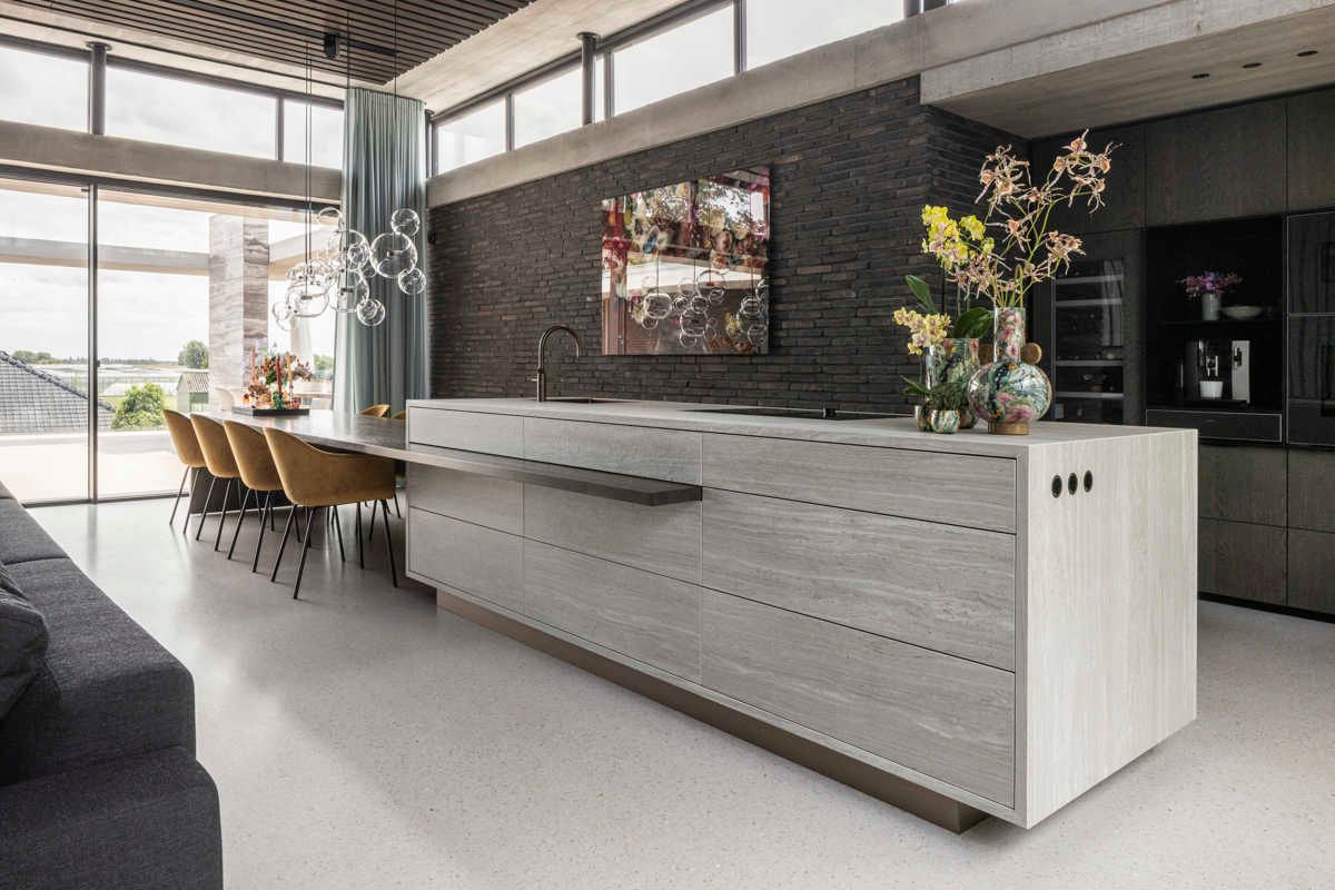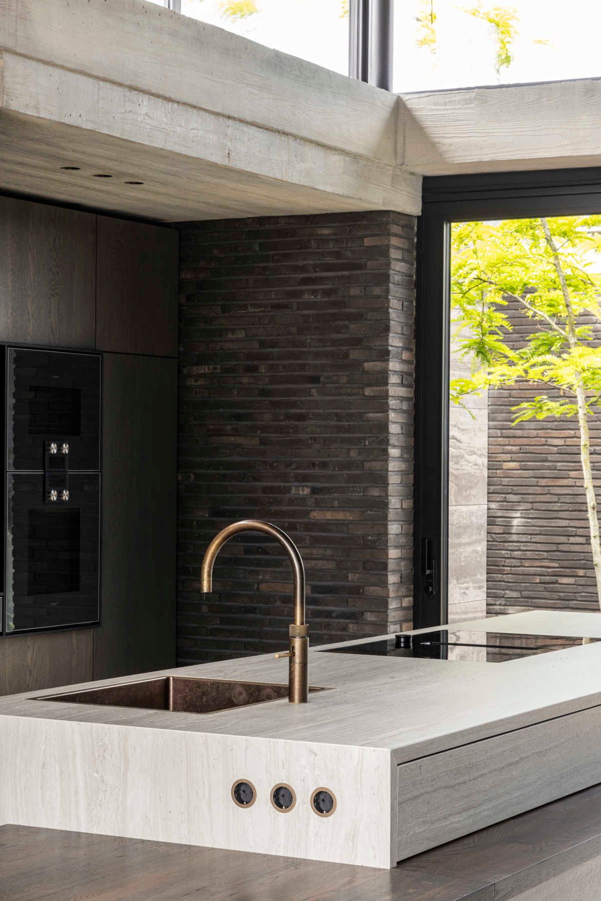 Wnętrze oparte na harmonii materiałów surowy beton, szklane tafle i ciemny klinkier tworzą wysublimowaną, elegancką kompozycję. Centralnym punktem jest wyspa z rysunkiem kamienia, której monumentalna forma podkreśla minimalistyczne założenia projektu. Grafitowa cegła nadaje przestrzeni przytulności i głębi, a wszechobecne światło naturalne wydobywa jej subtelną fakturę. Całość prezentuje ponadczasową estetykę, idealną dla architektury nowoczesnej, świadomie ukształtowanej i funkcjonalnej.